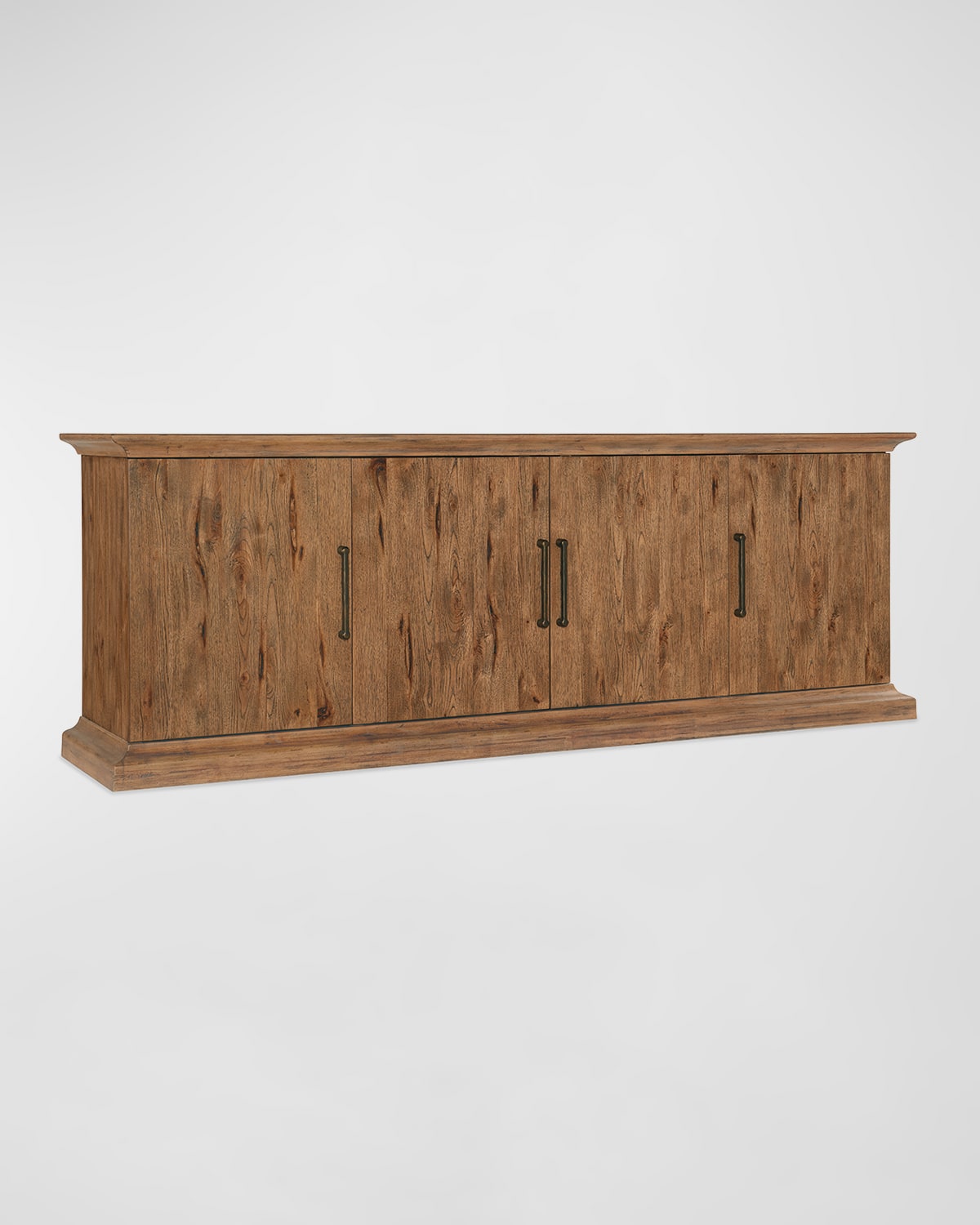 Bring home your dream of wide open spaces and a life lived in tandem with iconic landscapes with the Big Sky Media Console, featuring a solidwood edged top and dark brushed bronze bar pull handles. Handcrafted of hardwood solids and veneers Distressing includes chopping, rock, drawknife, gauging, chain distressing, and wire brush Charred timber finish on the interior Accommodates an 80" TV Four doors with softclose hinges and magnetic door catches One selfclosing drawer behind center pair of doors Two adjustable shelves behind each left and right door One adjustable shelf behind pair of center doors Ventilated back panel Fc705 threeplug electrical outlet Overall, approx. 90"W x 20"D x 32"T Includes hardware Imported Boxed weight, approximately 315.0 lbs