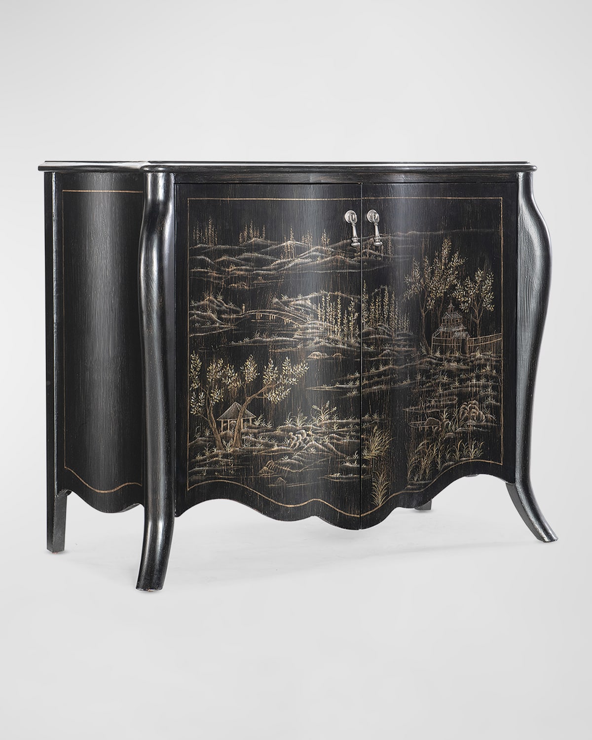Chest features door fronts with a handpainted chinoiserie design inspired by the confluence of culture throughout Southeastern Asia. Two doors with softclose hinges and magnetic door catches One adjustable shelf Levelers Antique pewter pendant hardware Overall, approx. 44.25"W x 21"D x 36"T Includes hardware Weight, 154.0 lbs Imported Boxed weight, approximately 183.0 lbs