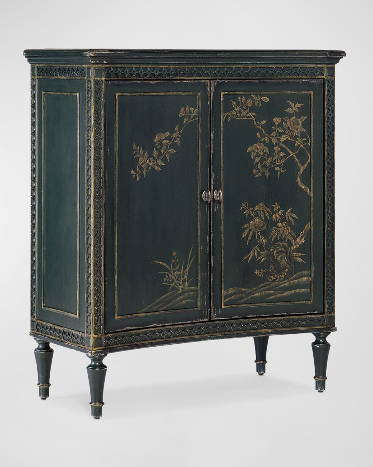 This concaveshaped chest features regionally inspired hand painting and highlighting on the door fronts and decorative fretwork accents along the edges. It's finished in Charleston Green, a weathered interpretation of the classic dark green that adorns trim, shutters, and doors across the historic district of Charleston. Two doors with softclose hinges and magnetic door catches One adjustable shelf behind doors Antiqued bronzefinished loop pulls Levelers Overall, approx. 32.75"W x 15"D x 37.75"T Includes hardware Weight, 75.0 lbs Imported Boxed weight, approximately 128.0 lbs