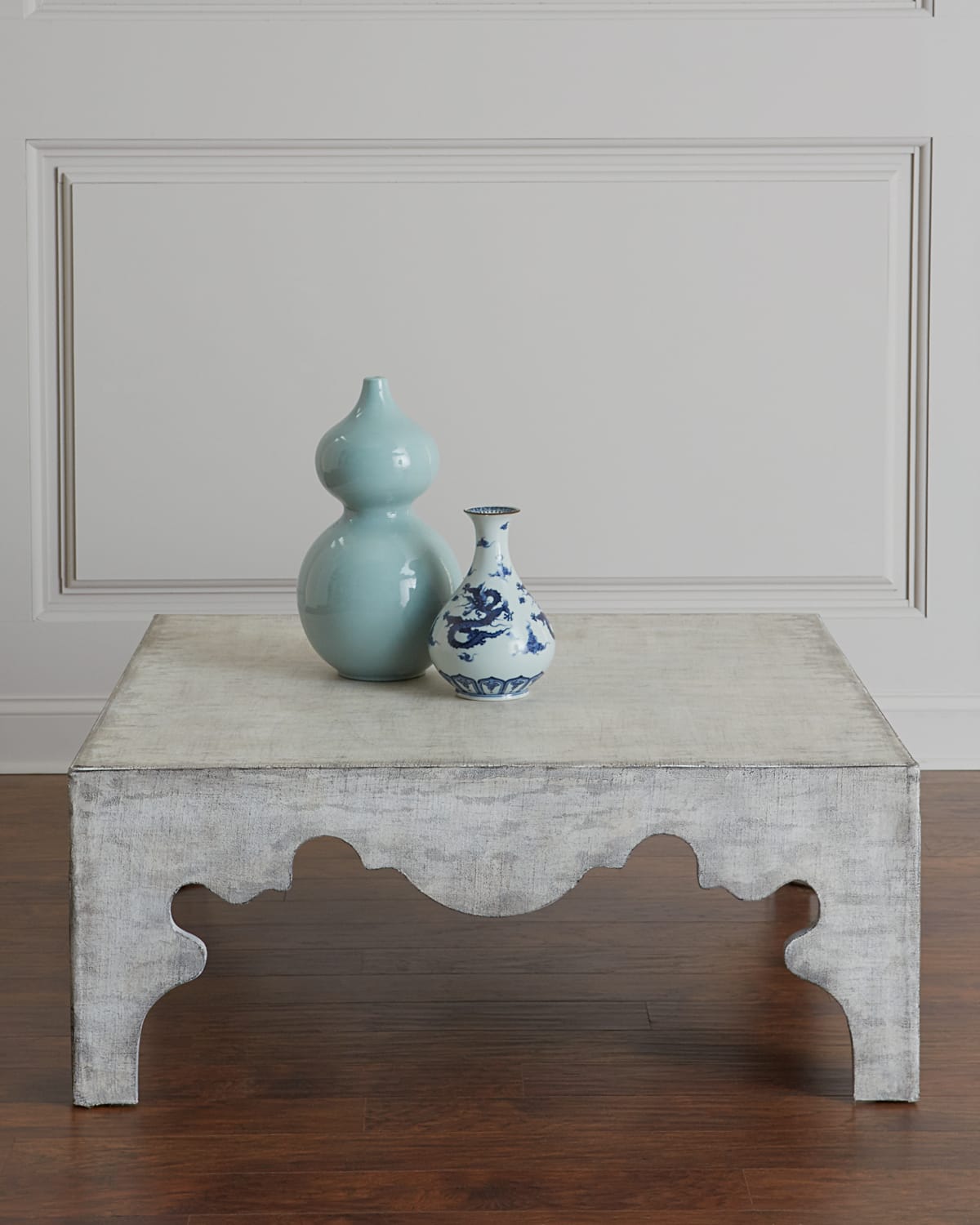 Handcrafted coffee table. Poplar and hardwood solids with linen. 40"Sq. x 16"T. Imported. Boxed weight, approximately 86 lbs.