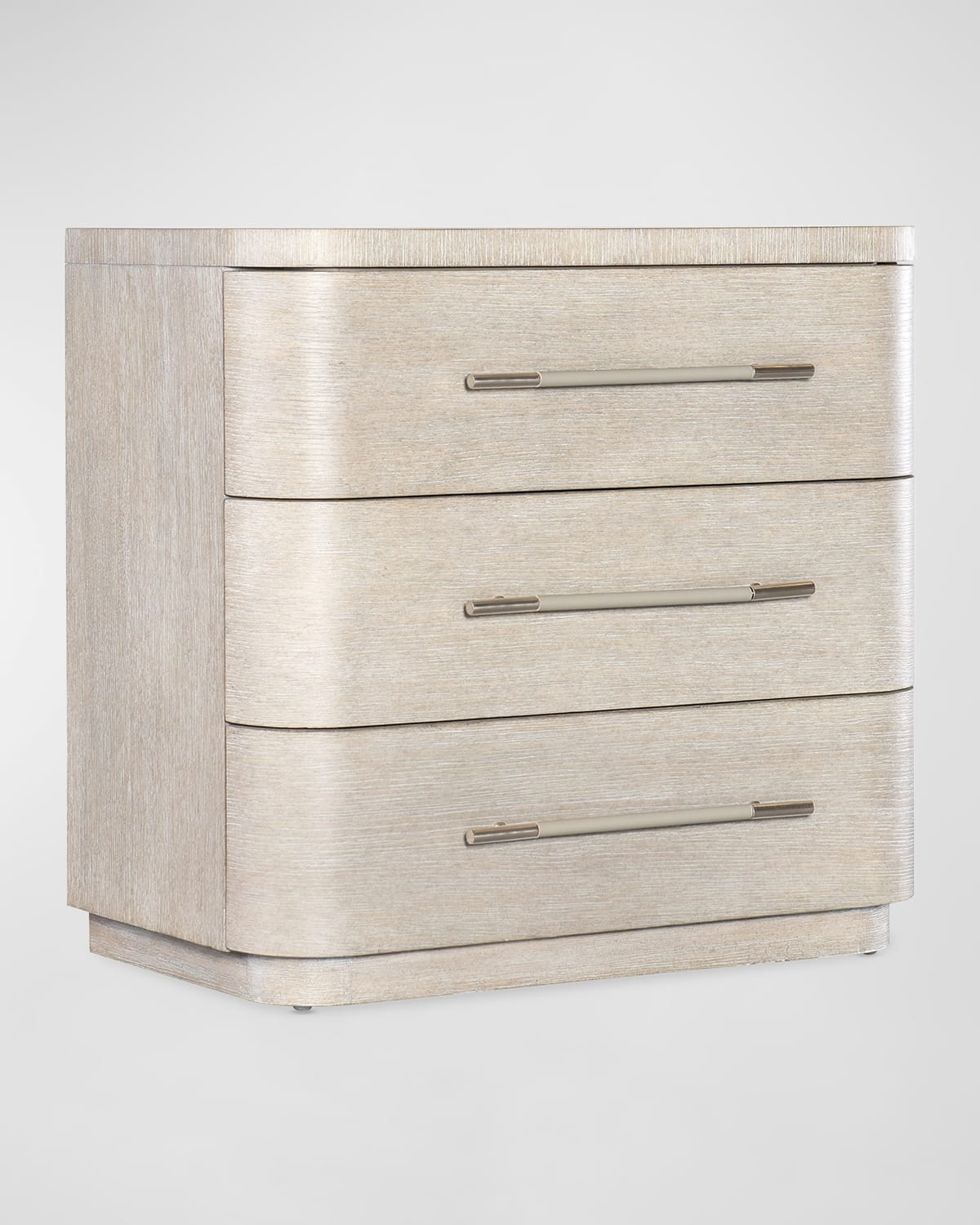 Handcrafted of engineered hardwood, oak veneers, and leather Choice of diamond alabaster or mink The diamond finish has crystallike alabaster and pewter hues, offering a serene style and the mink finish has dark, earthy brown hues with notes of black, also offering a serene style. Three selfclosing drawers Overall, approx. 32"W x 18"D x 30"T Includes hanging hardware Imported Weight, 127.0lbs Boxed weight, approximately 141.0lbs