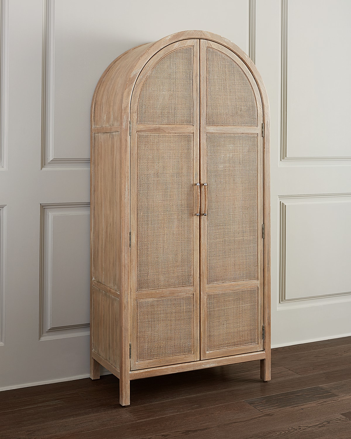 Handcrafted wardrobe features abundant storage and distressed detail Two doors have rattan inserts and four selfclosing drawers One fixed shelves and two adjustable shelves with a removable clothing rod Made of hardwood solids and veneers Overall, approx. 40"W x 23"D x 86.25"T Hardware included Assembly not required For indoor use Imported Weight, 260.0lbs Boxed weight, approximately 305.0lbs