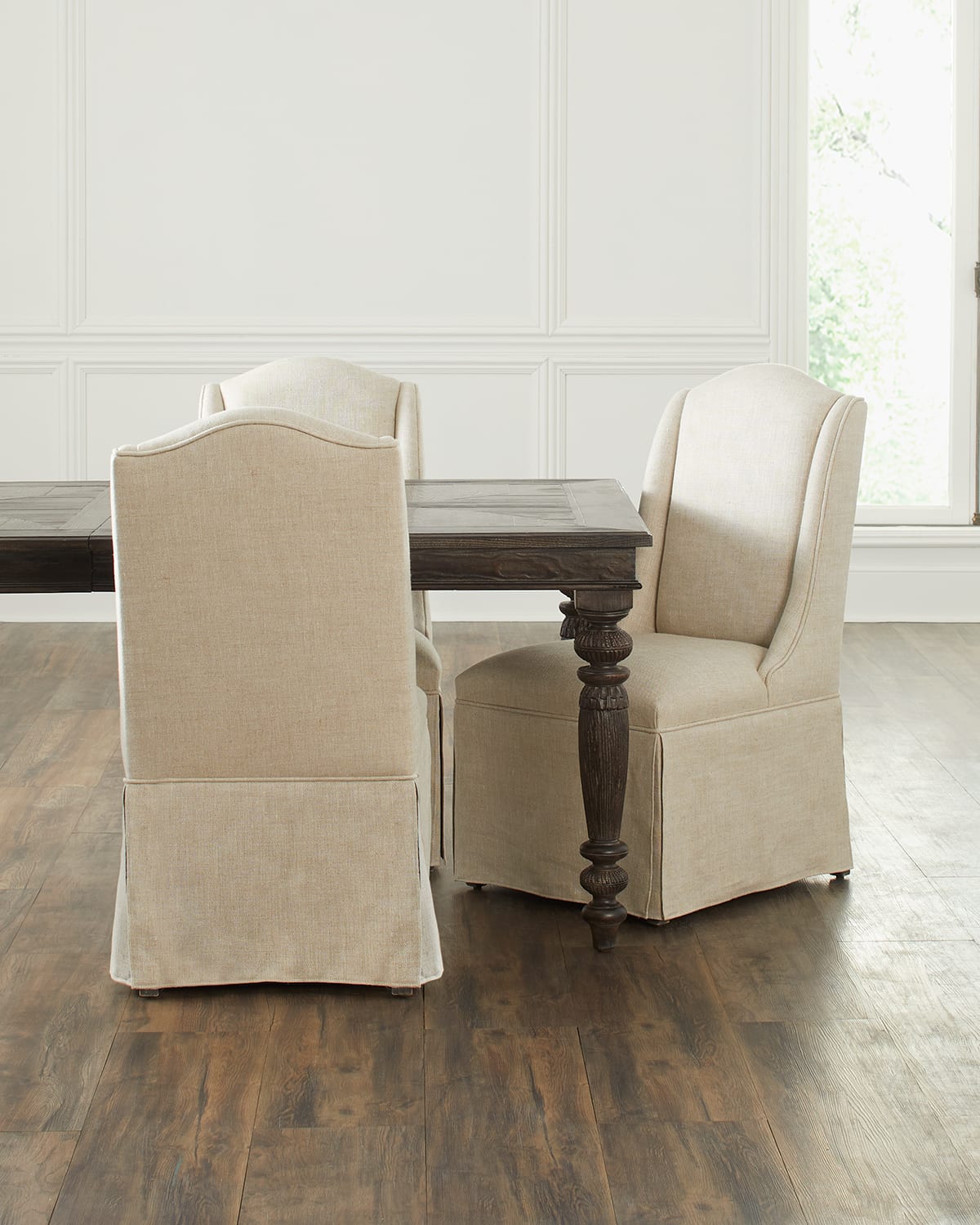 Perfect as a dining host chair, extra family room, or bedroom chair, the chic "Traditions" slipper chair has a slipcoverlike upholstered seat and back with a skirt featuring the biscuit linen performance fabric for stain resistance and easy cleanability. Made of hardwood and linen Overall, approx. 21.3"W x 27"D x 41"T Seat width, 20.3" Seat depth, 18.5" Seat height, 19" Sold individually Finished Back Spot clean Imported Weight, 30.0lbs Boxed weight, approximately 40.0lbs