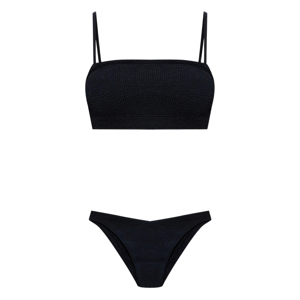 black crinkle texture thin straps underband detail two-piece set Be mindful to try on swimwear over your own garments.