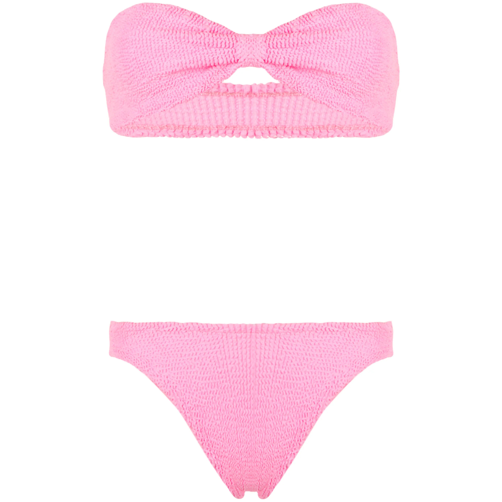 bubblegum pink Top: bandeau style strapless Bottoms: stretch design high waist Be mindful to try on swimwear over your own garments.