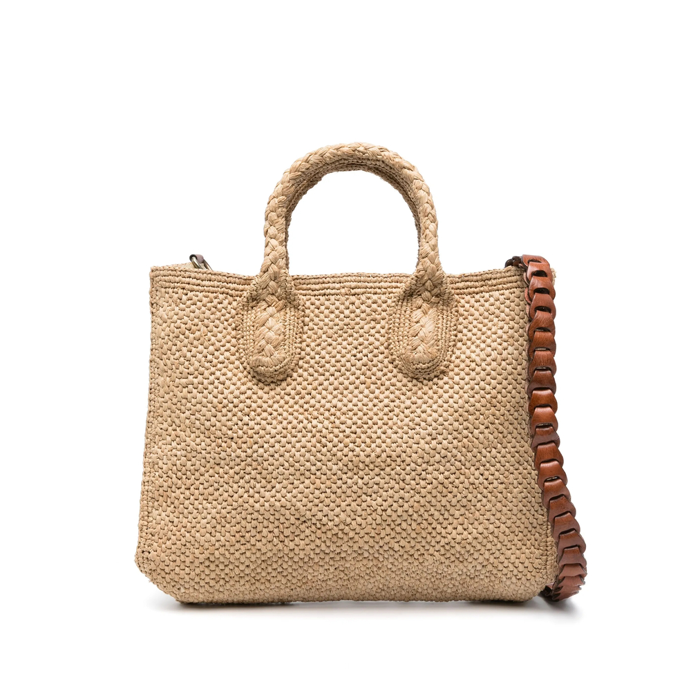 beige raffia woven raffia design detachable leather shoulder strap two braided top handles main compartment internal patch pockets internal logo patch full lining open top with magnetic fastening This piece is handmade, meaning your purchase is unique and may vary slightly from the item pictured.