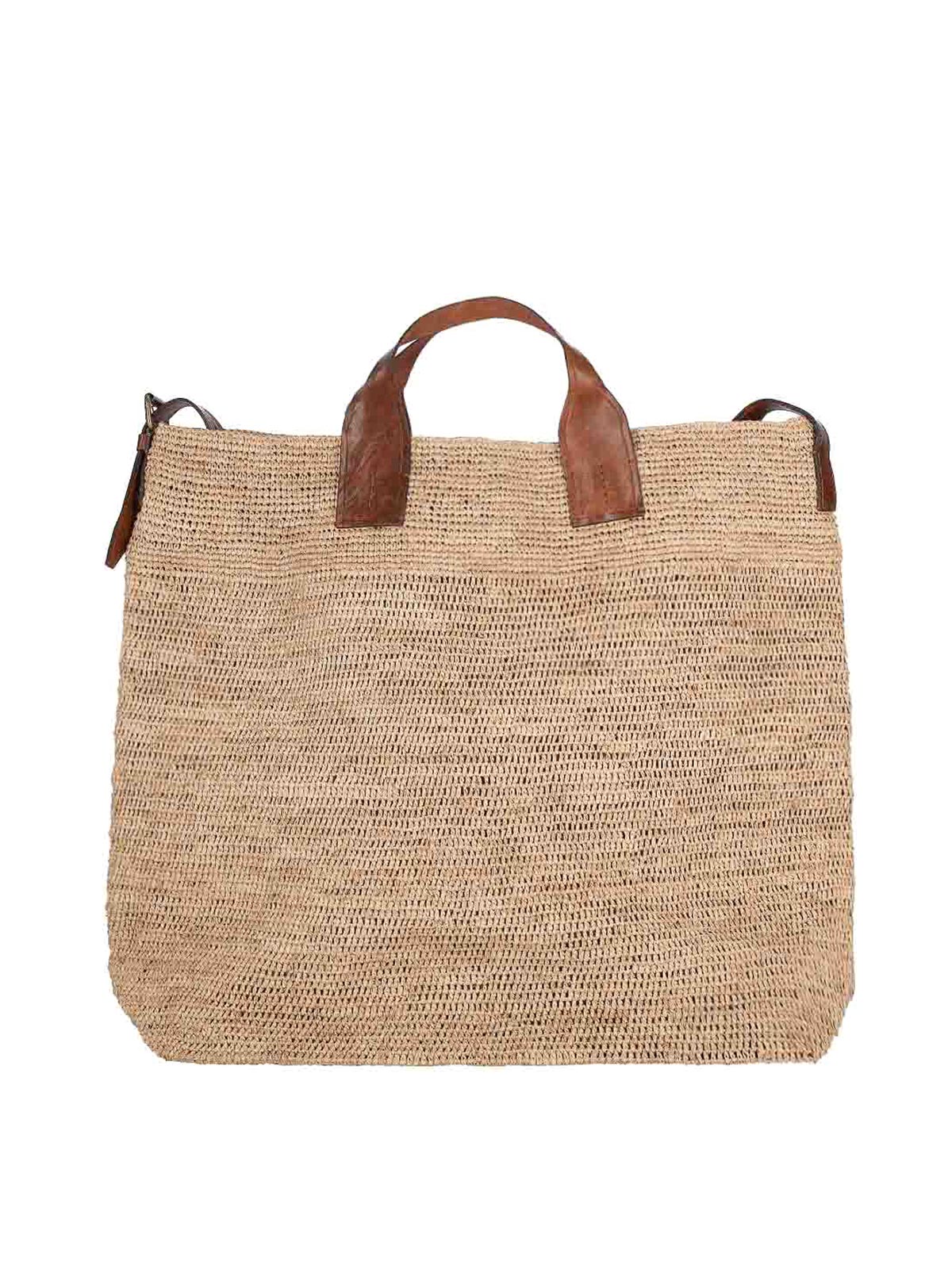 Sac cabas Flamingo ibeliv beige à la main, deux hautes anses marron ajustables, une poche plate et plate, un compartiment principal