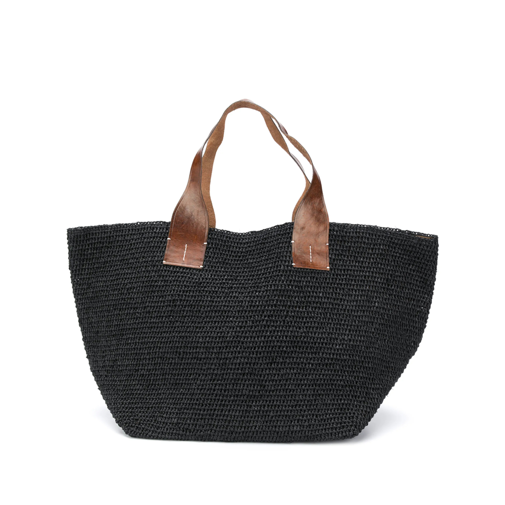 black/brown cotton/raffia/leather circular top handles internal logo patch open top concealed magnetic fastening