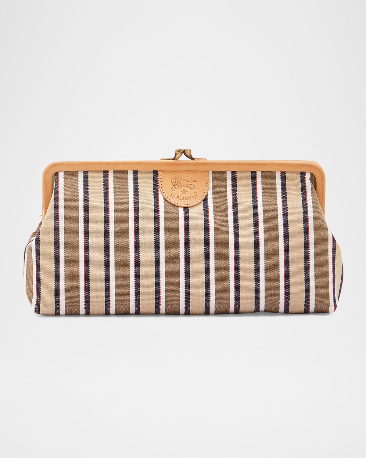 Il Bisonte "Manuela" clutch bag in canvas cotton and leather Framed top with kisslock closure Interior, one slip pocket Lining: Cotton Approx. 5.5"H x 10.2"W x 2.8"D Item Weight (Lbs.): 0.5 Made in Italy
