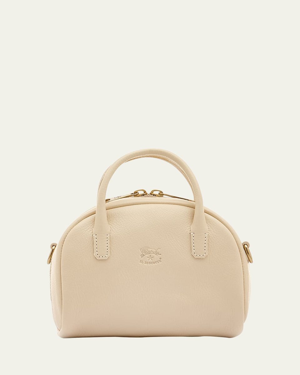 Il Bisonte "Quercia" top handle bag in soft vegetabletanned cowhide leather Rolled top handles Detachable, adjustable shoulder strap, 17.7" drop Twoway zip top closure Interior, one slip pocket Lining: Organic cotton Approx. 5.5"H x 7.1"W x 2"D Item Weight (lbs.): 0.7 Made in Italy
