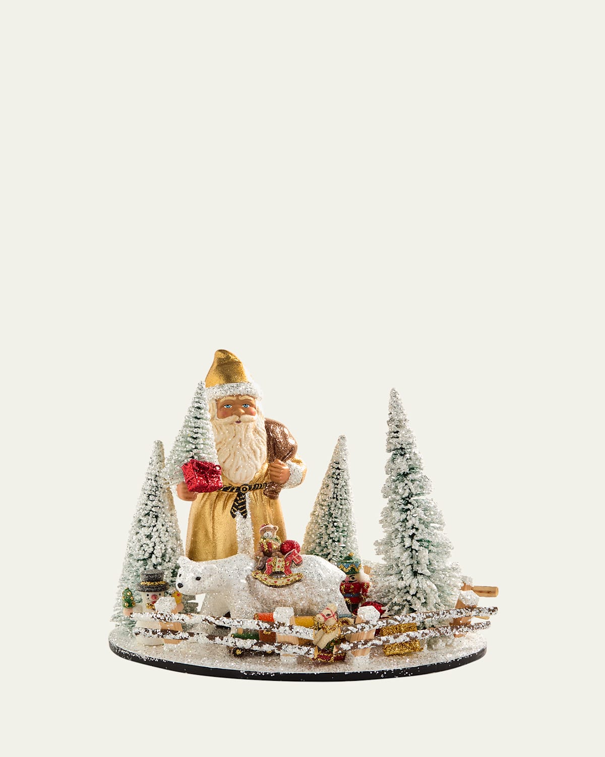 This handpainted Santa stands with Christmas trees, a snowman, and a polar bear. Glitter finishes the paper mache Santa. Handcrafted of paper mache and wood Approx. 12.6"L x 9.5"W x 11.0"H For indoor use Made in Germany Boxed Weight (Lbs): 1.5