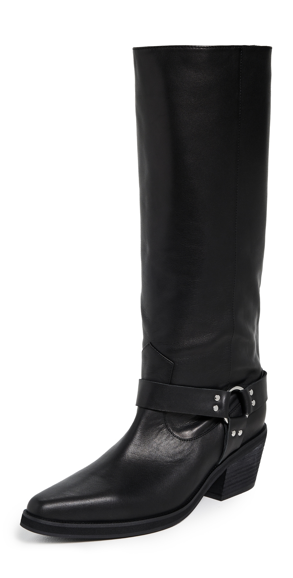 Upper: Cowhide. Straps and silver-tone O-ring at ankle. Lining: Synthetic. Stacked heel. Ankle zip. Pointed toe. Rubber sole. Imported, China. This item cannot be gift-boxed. Measurements: Heel: 2in / 50mm 15in / 38cm Circumference: 15.75in / 40cm