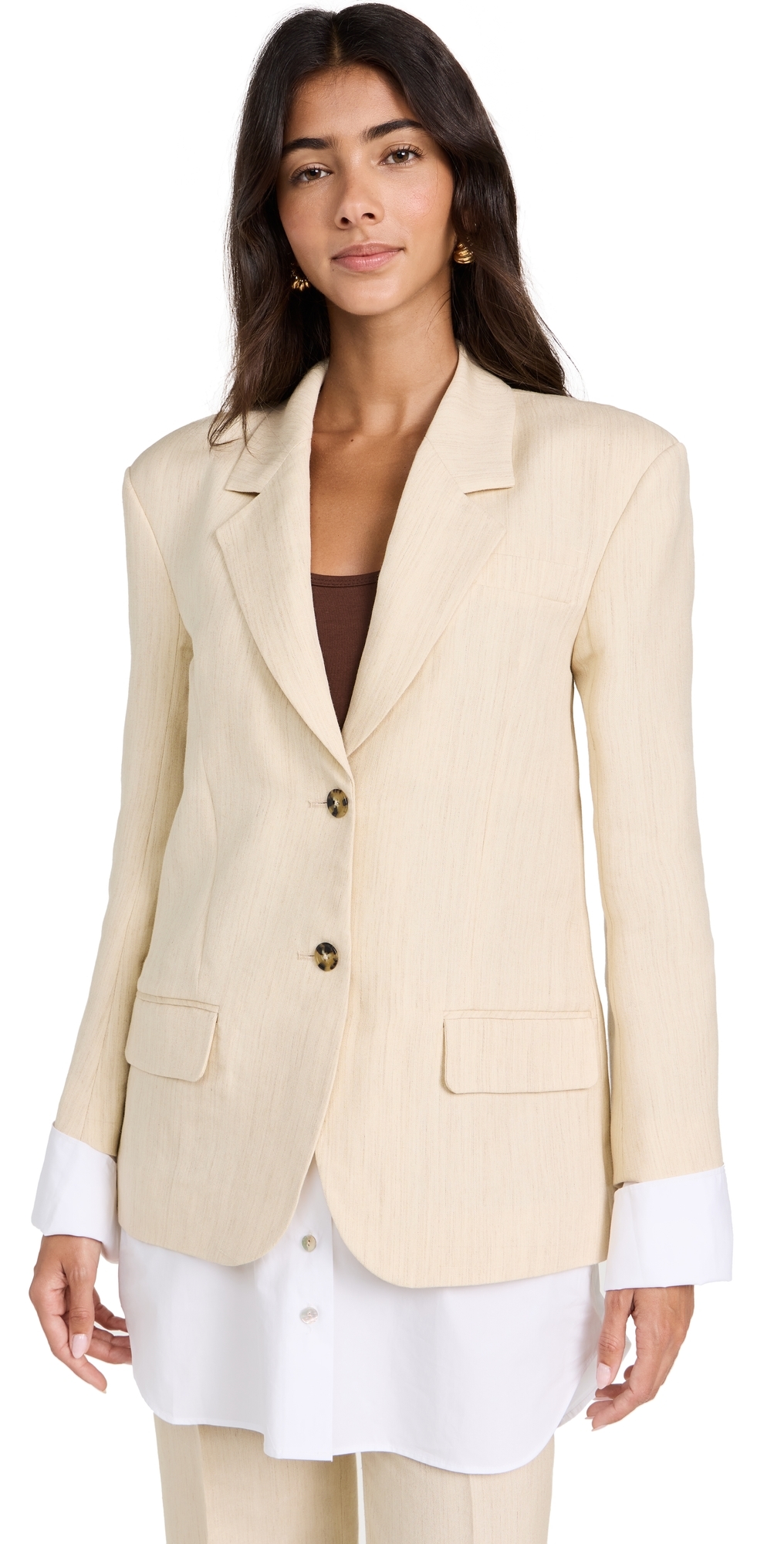 Fabric: Mid-weight, non-stretch suiting. Optional button-off shirting hem. Long sleeves with extended contrast cuffs. Collared neck with notched lapels. Welt breast and flap front pockets. Padded shoulders. Button placket. Shell: 47% viscose/45% silk/8% linen. Lining: 100% cupro. Dry clean. Imported, China. Measurements: Measurements from size 0 Length: 33in / 84.0cm, from shoulder