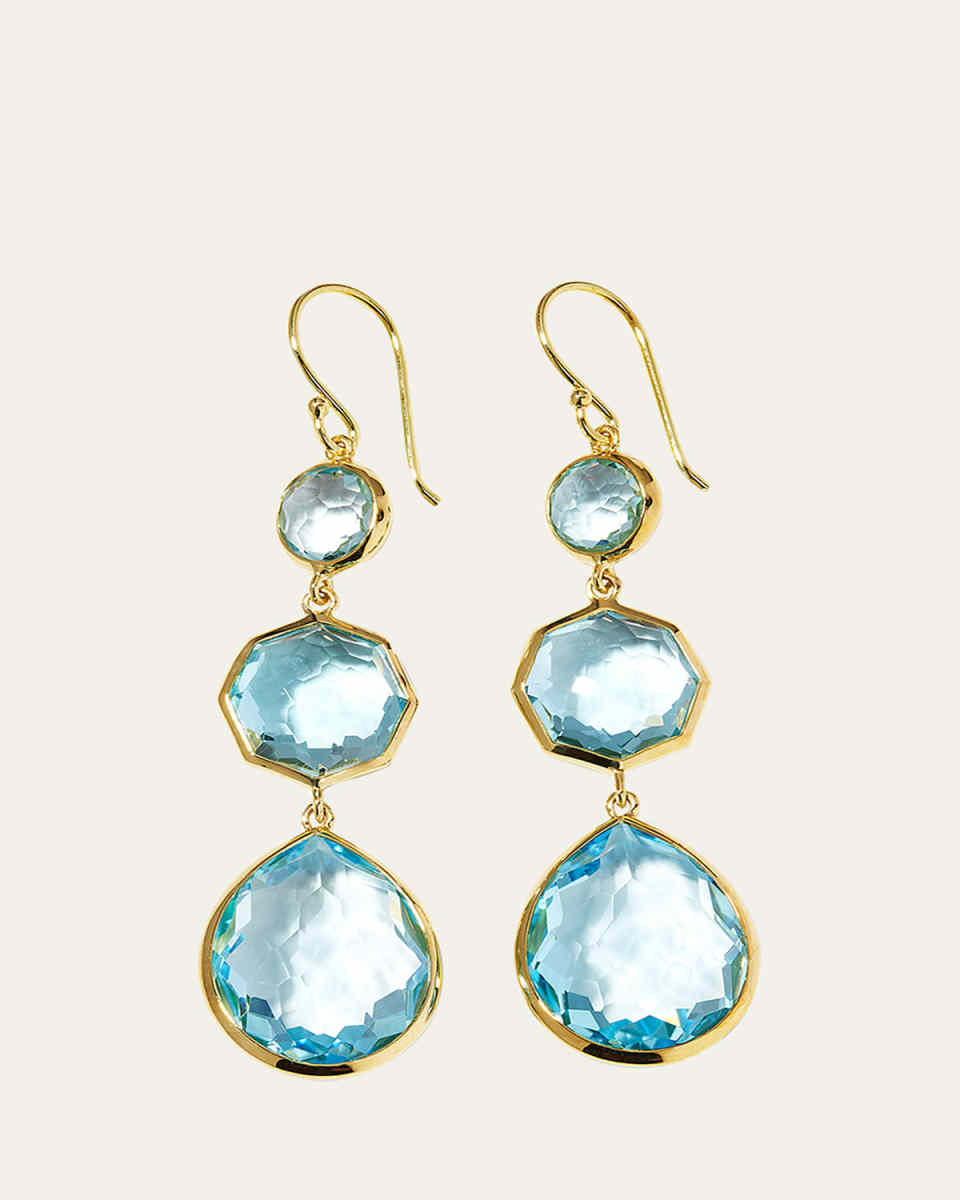 Ippolita dangle/drop earrings Approx. 2"L 18karat yellow gold A precious material distinguished by its beautiful natural striations Rock crystal and motherofpearl doublet, blue topaz, turquoise, greengold citrine, orange citrine or amethyst Curved french hooks for pierced ears Imported