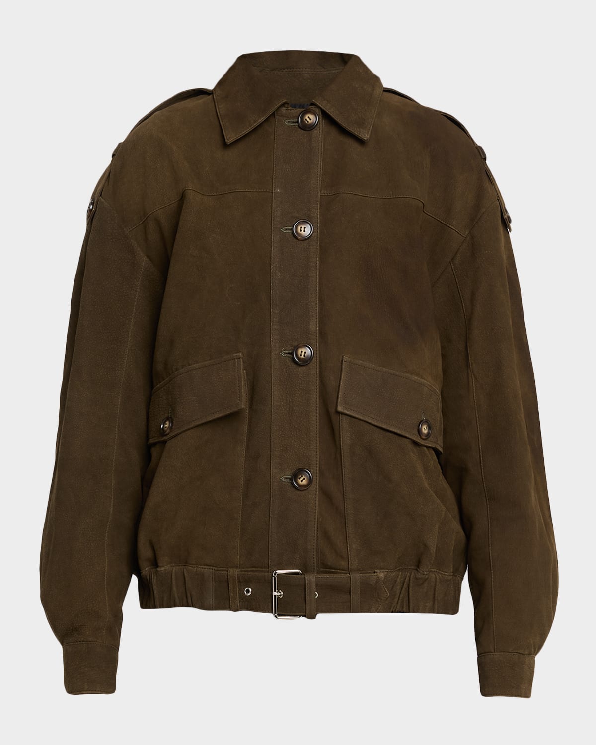 Iro "Barrie" suede jacket reimagined with shirtlike elements, featuring a front button closure and a belted hem Spread collar; button front Long, dropped sleeves; epaulets Large buttondown front flap pockets Partial belted front hem with elasticized sides Oversized cut Fully lined Suede Imported