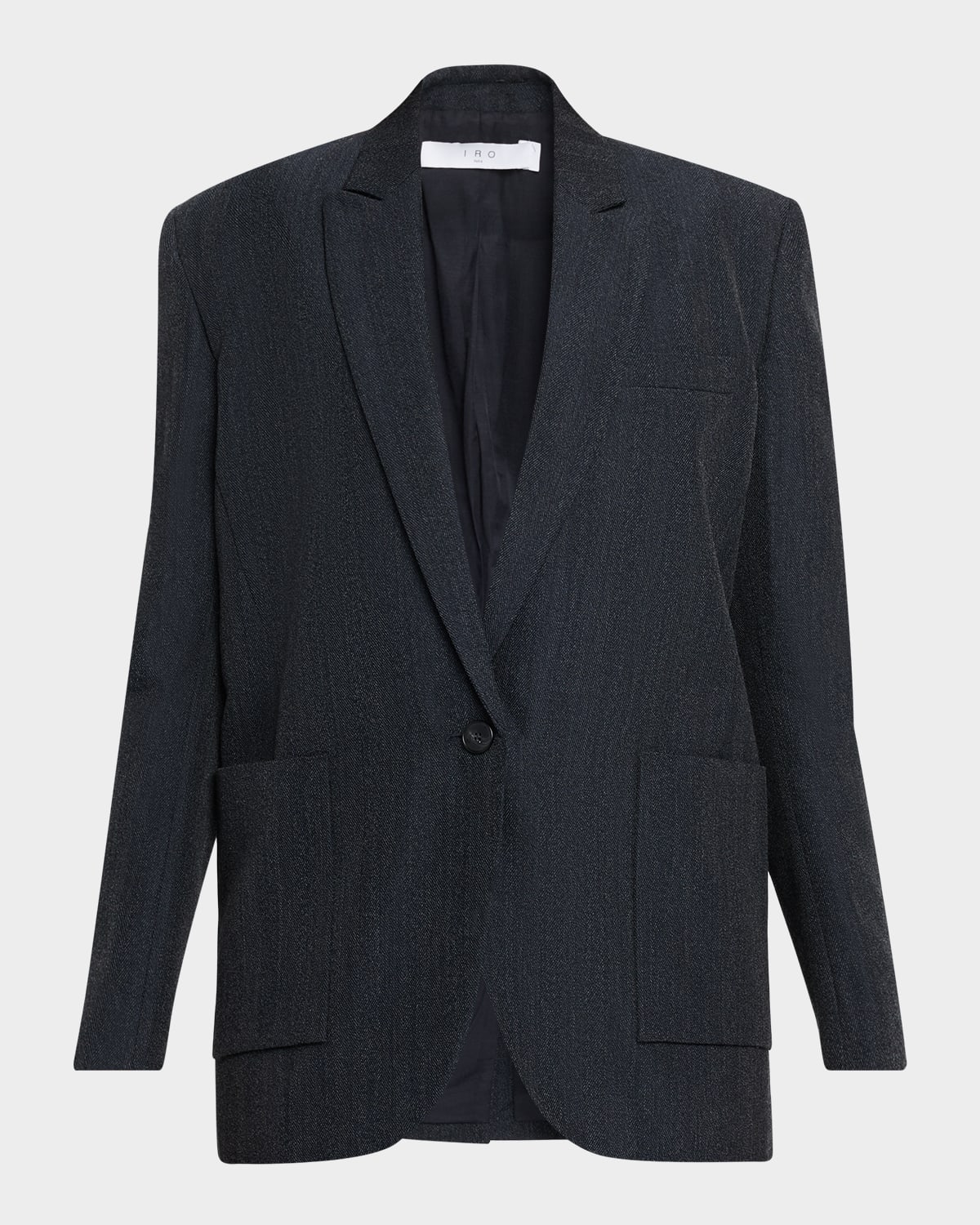 Balancing strength and softness, the Iro "Bonna" blazer in woolblend features bold shoulders and curved lines in a relaxed form Notched collar; onebutton front Long sleeves; strong shoulders Piped chest pocket Front patch pockets Cutaway front hem hits the hip Vented back hem Loose fit Wool/polyester Made in Bulgaria