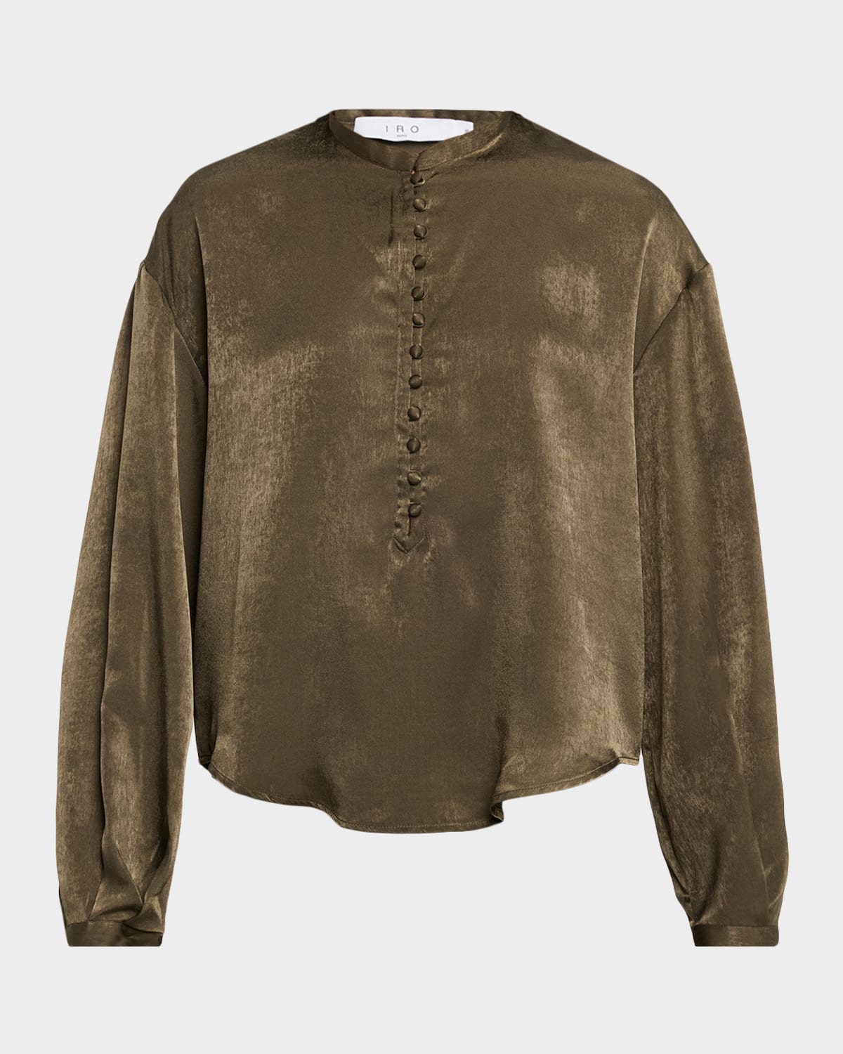 Iro "Ezia" blouse showcases a modern style in lustrous fabric with a flutter silhouette that combines vintage elements such as decorative buttons and a high neckline Band collar; coveredbutton front Long, dropped sleeves; button cuffs Inverted back pleat Fluid silhouette Flutter hem Polyester Imported