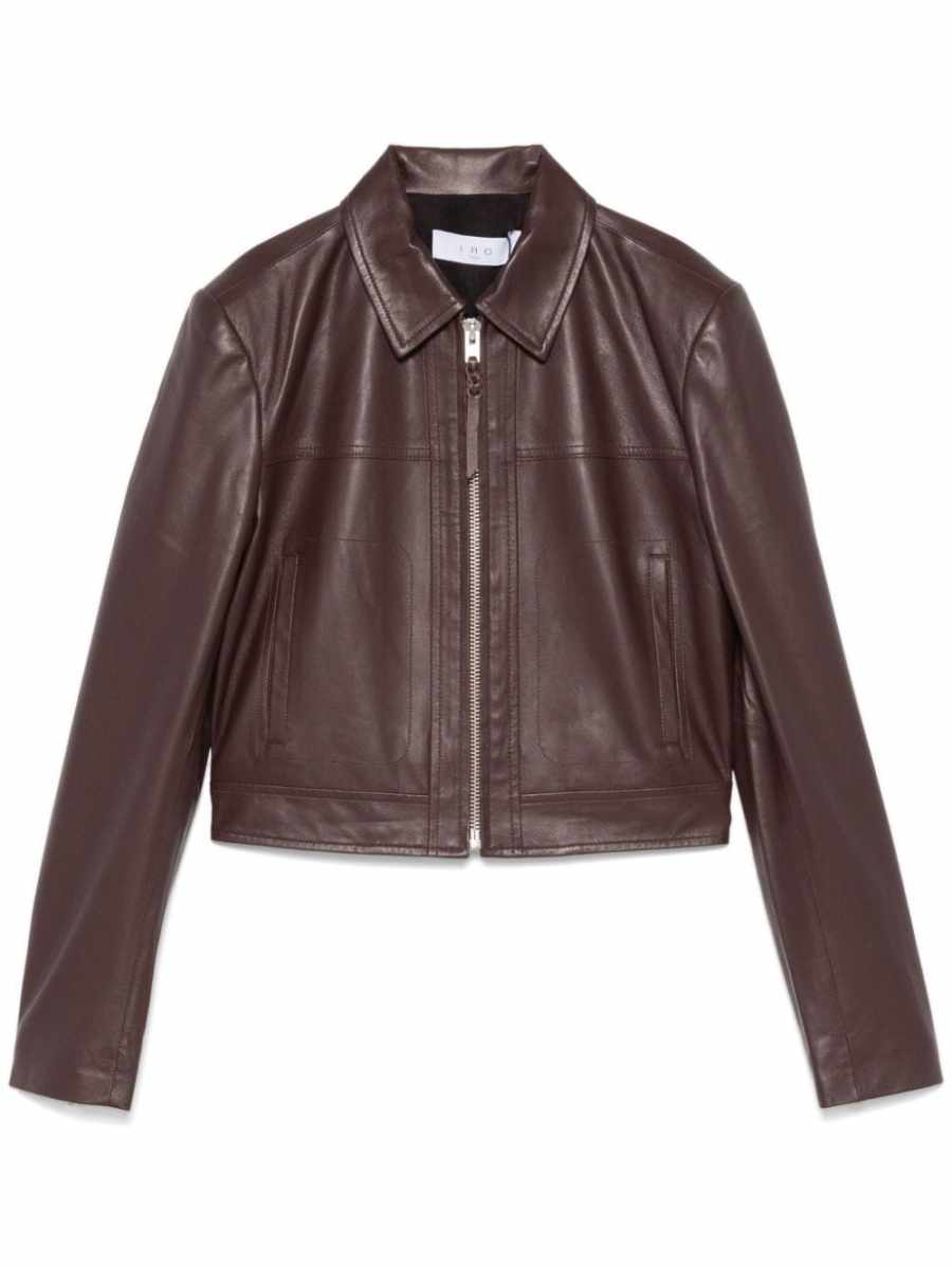 chocolate brown lambskin smooth grain front zip fastening classic collar shoulder pads long sleeves cuff zips two side welt pockets full lining straight hem cropped
