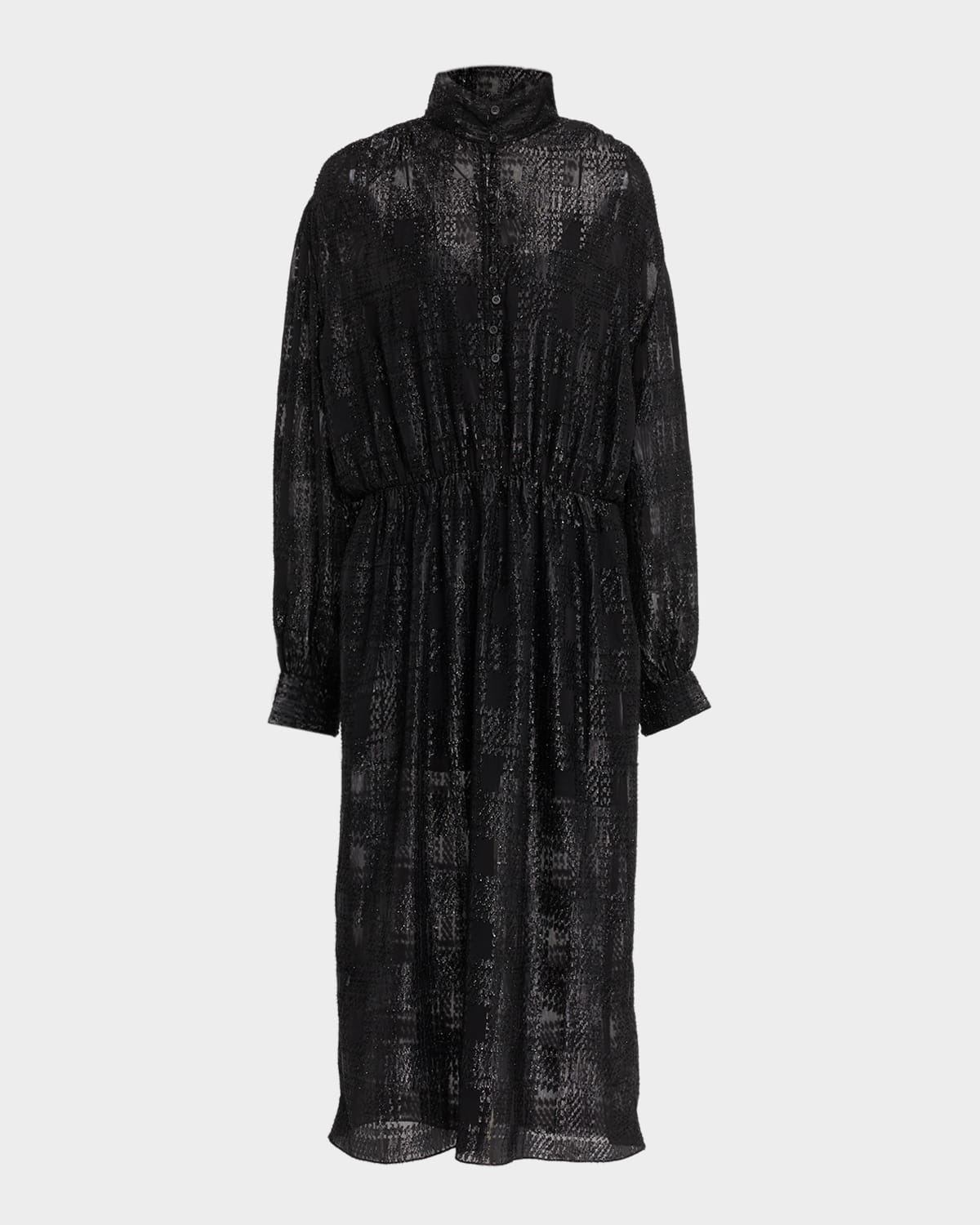 Rendered in a semisheer fabrication, the "Vasco" shirtdress by Iro is detailed with a sequinembellished plaid design High neckline; partial button front Long blouson sleeves; button cuffs Elasticated waistband Hem falls below the knee Slipover style Rayon/cellulose acetate/polyester Imported