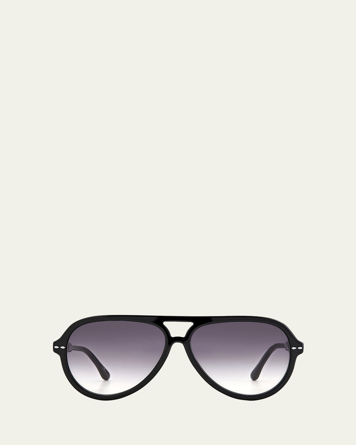 Isabel Marant sunglasses in acetate. Lens/bridge/temple (in mm): 5913145. Features iconic silver leaf metal trim on front and temple. Aviator frames with brow bar. Gradient lenses. Thin, tapered arms with logo script at left temple. 100% UVA/UVB protection. Imported.