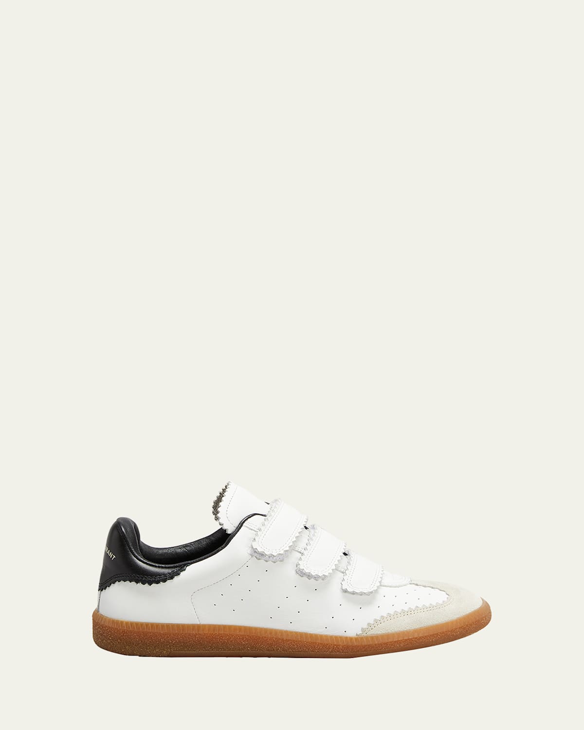 Isabel Marant leather and suede sneakers. Flat textured heel. Round cap toe. Triple grip strap vamp. Contrast collar, tongue and logo. Leather lining. Rubber outsole. "Beth" is made in Portugal.