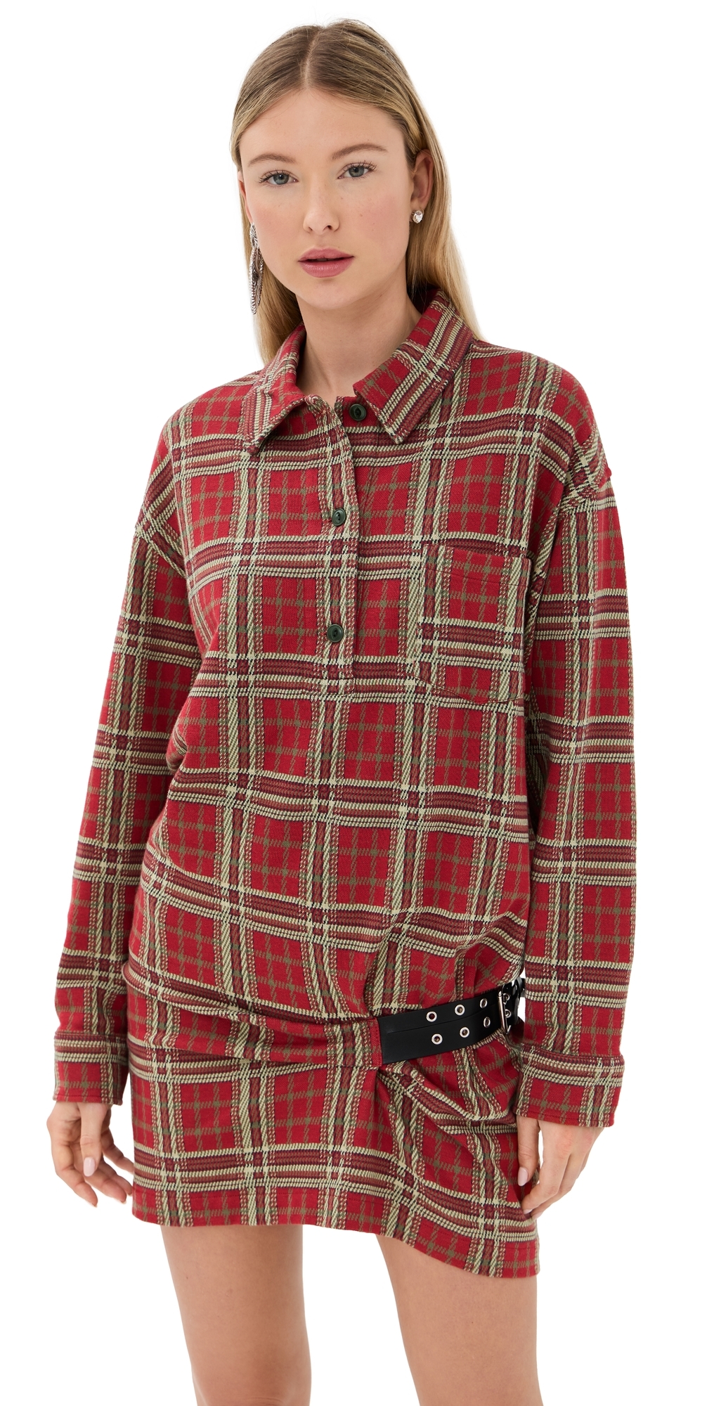Fabric: Mid-weight stretch jersey. Plaid pattern. Attached faux leather double belts at waist. Box pleat at back. Mini length. Polo neckline. Long sleeves with button cuffs. Partial button placket. Patch breast pocket. Shell: 100% cotton. Trim: 100% polyurethane. Unlined. Hand wash. Made in Portugal. Measurements: Measurements from size 34 Length: 34.25in / 87.0cm, from shoulder to front hem