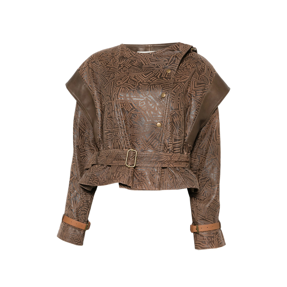 brown patterned belted front press-stud button fastening shoulder pads buckle strap cuffs