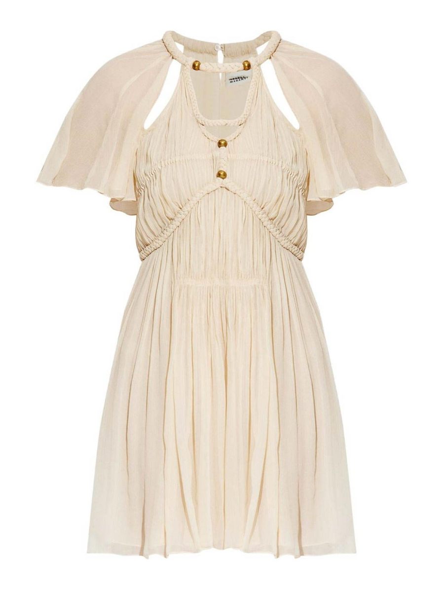 Encolure ronde avec finitions tressées, col boutonné, manches courtes papillon, fentes dans et dans le dos, fronces et ficelles à l'intérieur et au dos, finitions tissées assorties, perles, ornées sur le côté par une fermeture éclair cachée, queue froncée, coupe évasée