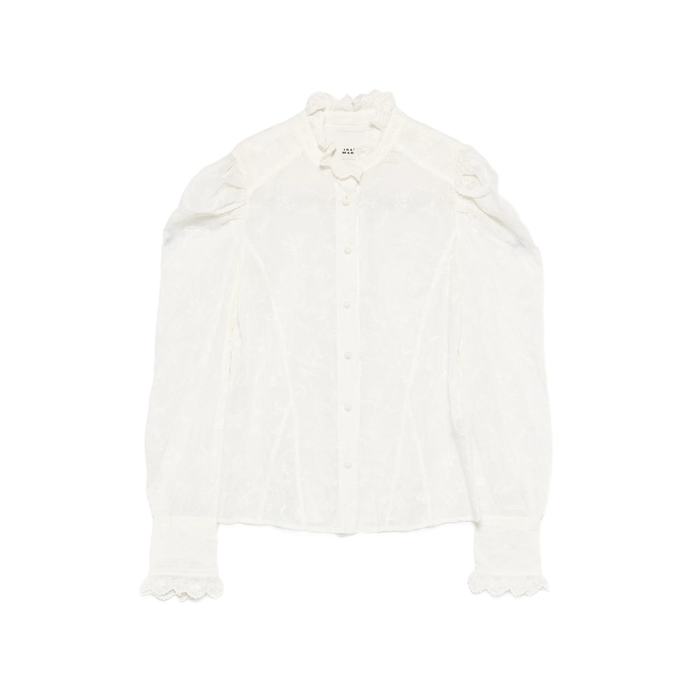 white textured design button fastening ruffled collar long sleeves ruffled cuffs