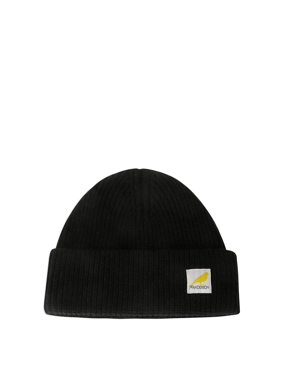 Casquette noire en tricot côtelé avec écusson à logo sur le revers et le bord retroussé