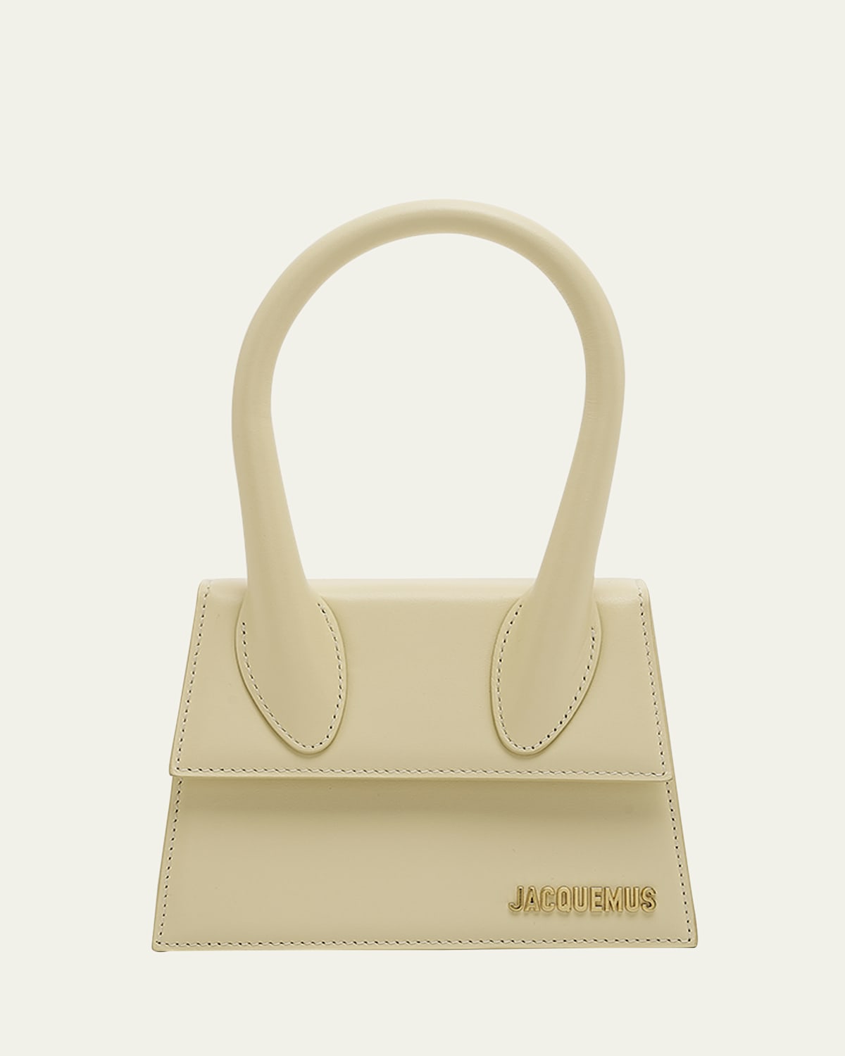 Jacquemus "Le Chiquito Moyen" top handle bag in smooth calf leather, cotton, and zinc alloy Features signature logo lettering on corner Rolled top handle Detachable, adjustable crossbody strap Flap top with magnetic closure Lining: Cotton Approx. 5.1"H x 7.1"W x 3.1"D Made in Italy