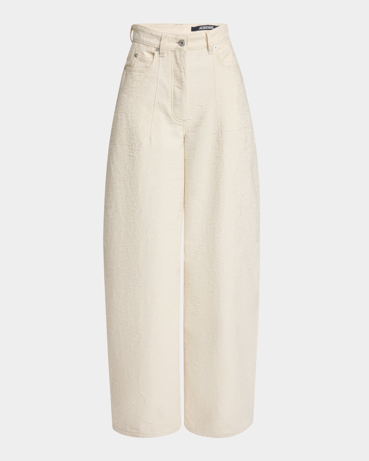 Jacquemus oval jeans in textured whitewash denim High rise Fivepocket style Full length Barrel legs Button/zip fly; belt loops Cotton Made in France