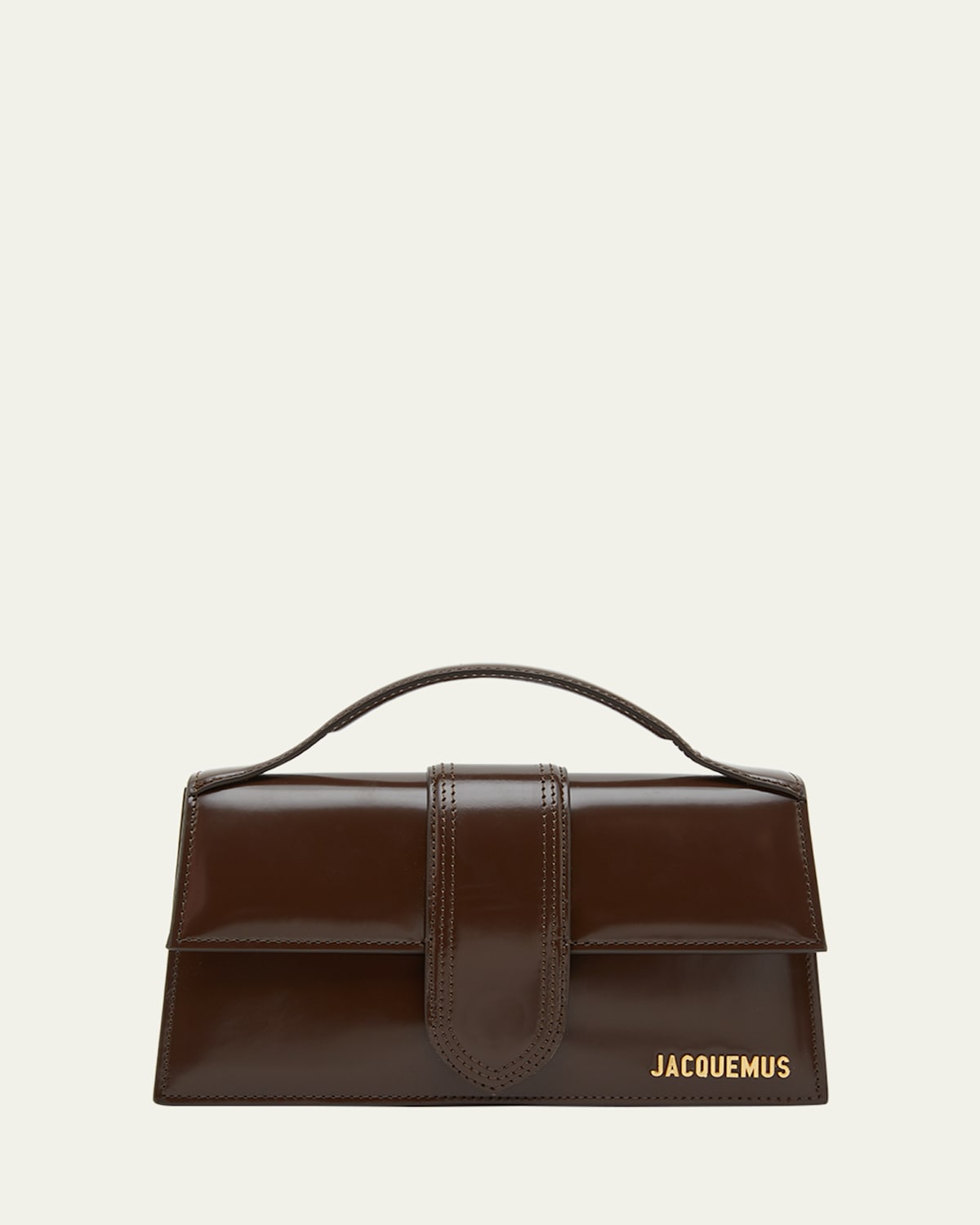 Jacquemus "Le Grand Bambino" crossbody bag in leather Features signature logo lettering on the corner Flat top handle Detachable, adjustable crossbody strap Flap top with magnetic closure Exterior, back slip pocket Interior, one slip pocket Lining: Cotton Approx. 6.9"H x 9.0"W x 5.5"D Made in Italy