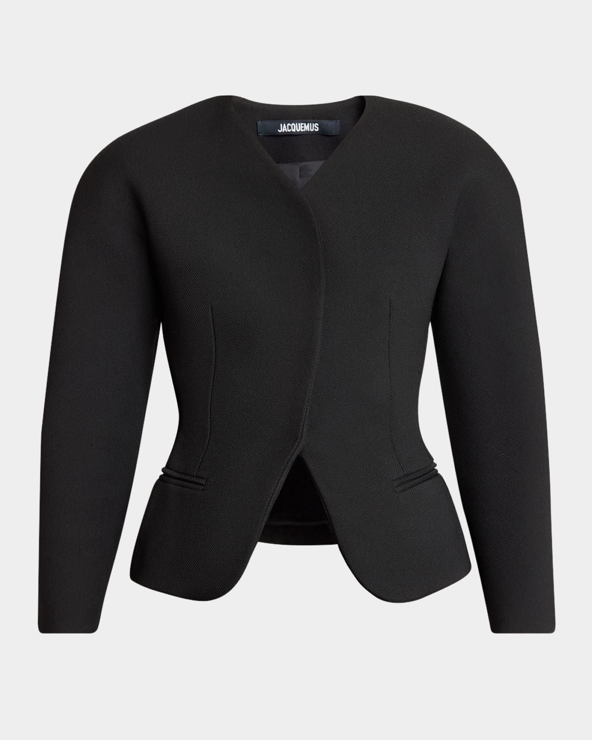 Jacquemus "The Ovalo" jacket enhanced with structured shoulders V neckline Curved bracelet sleeves Hip welt pockets Tailored fit Hem sits at the hip Front hook closure Polyester Lining: Viscose/cotton Dry clean Imported