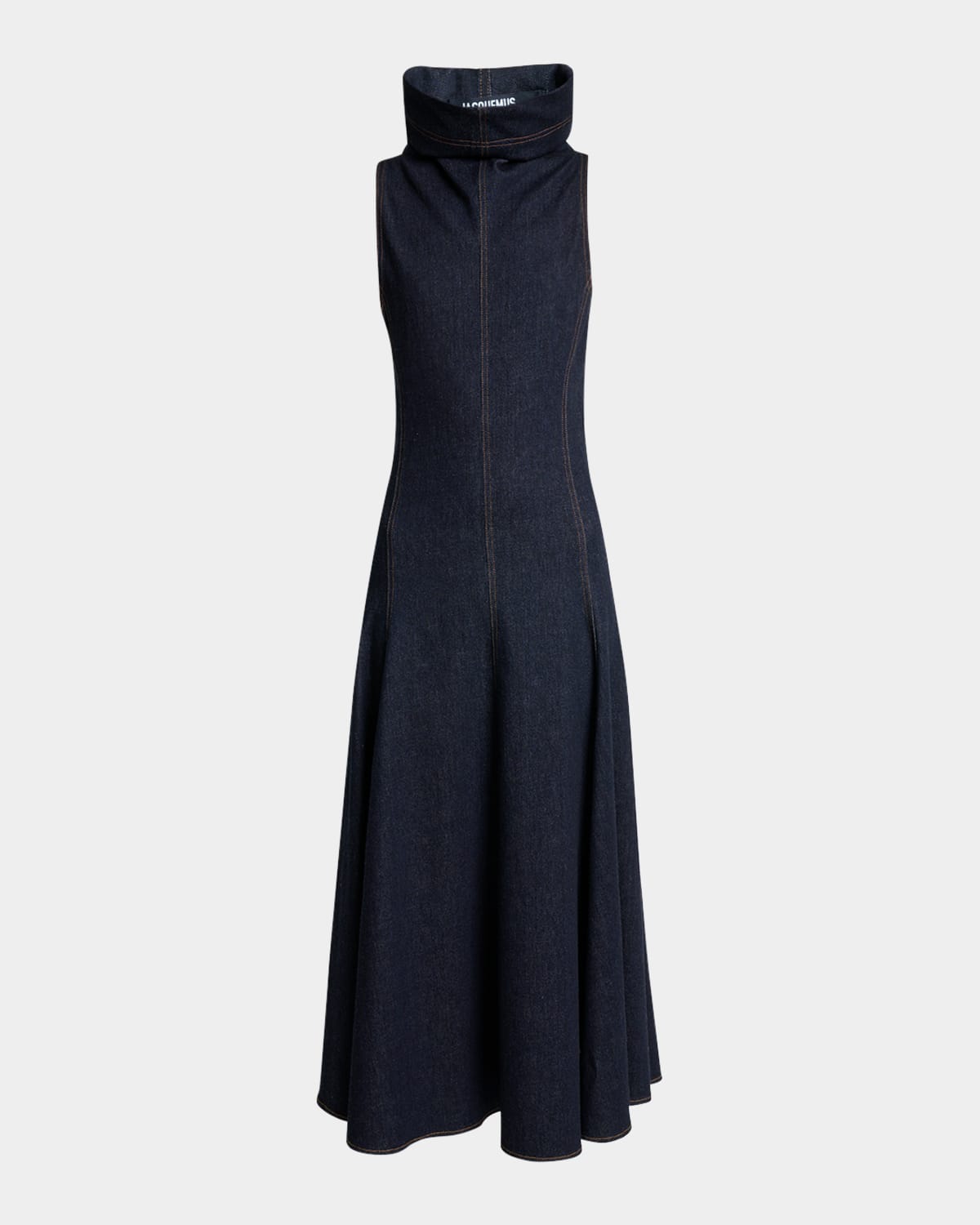 Jacquemus dress in darkwash denim with contrast stitching throughout Funnel neckline Sleeveless Side seam pockets Full length Aline silhouette Cotton/cashmere/elastane Made in France