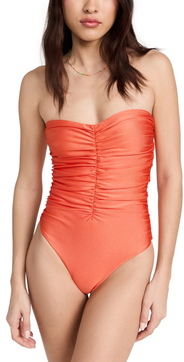Ruched design. Strapless silhouette. Shell: 78% nylon/22% lycra spandex. Lined. Hand wash. Made in the USA of imported materials.