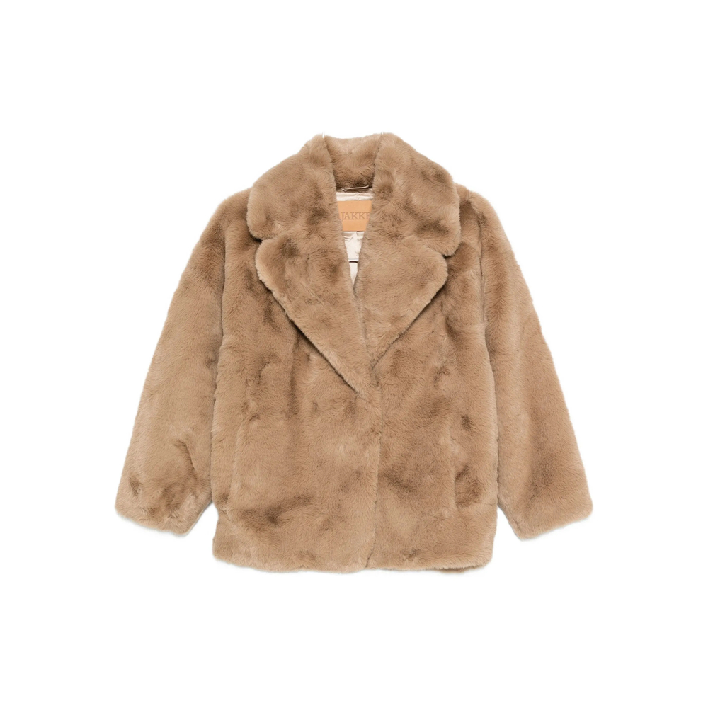 sand beige faux fur notched lapels front snap button fastening long sleeves straight hem