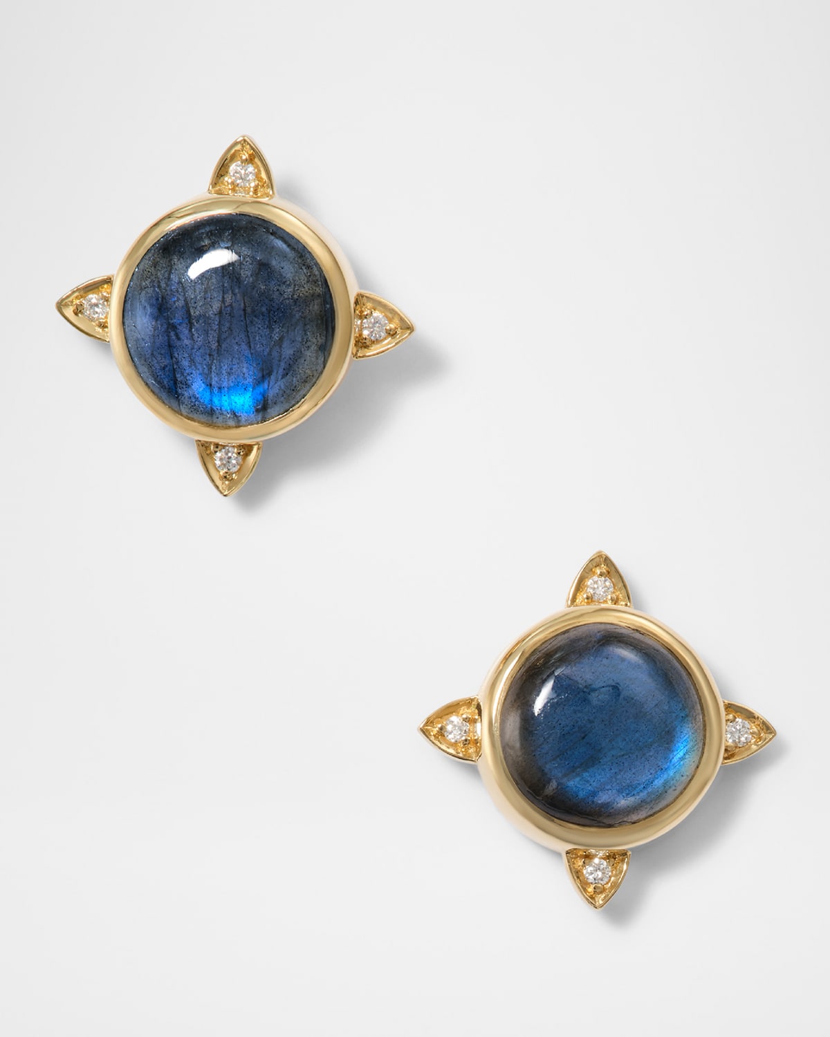 The perfect pop of shimmering blues, these labradorite studs are exquisite. Surrounded by four kisses of diamonds, these studs accent the lobe with gentle elegance from Jamie Turner. Polished 18karat yellow gold Brilliantcut Ecolor diamonds Diamond total carat weight: 0.04 Two 8mm labradorite cabochons Please note: All stones are unique and reflect beautiful variations. For pierced ears Post backs Made in USA from imported materials