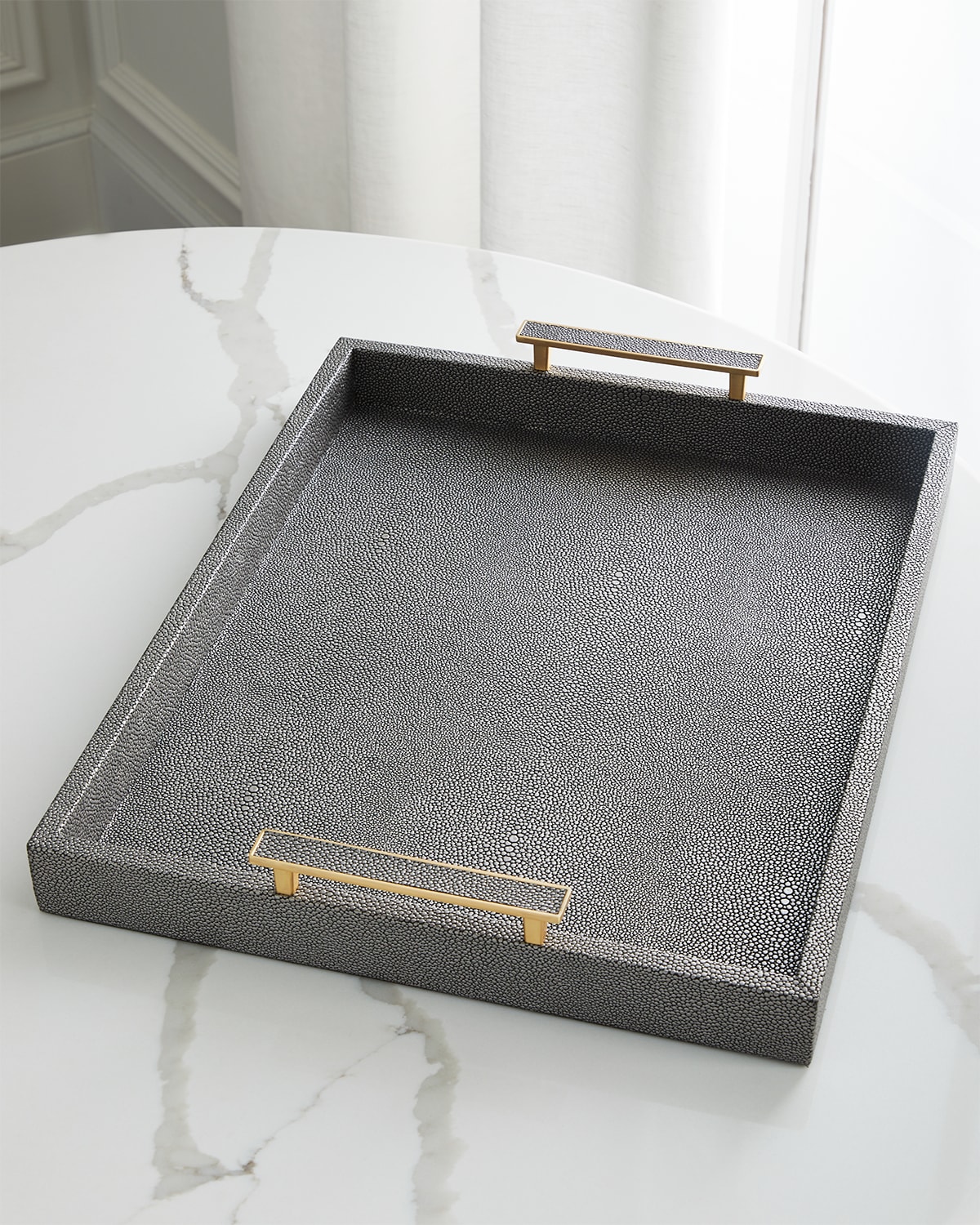Tray is made of faux shagreen (polyurethane) with metal handles Approx. 24"L x 16"W Sold individually Item Weight (Lbs.): 3.7 Wipe clean Imported