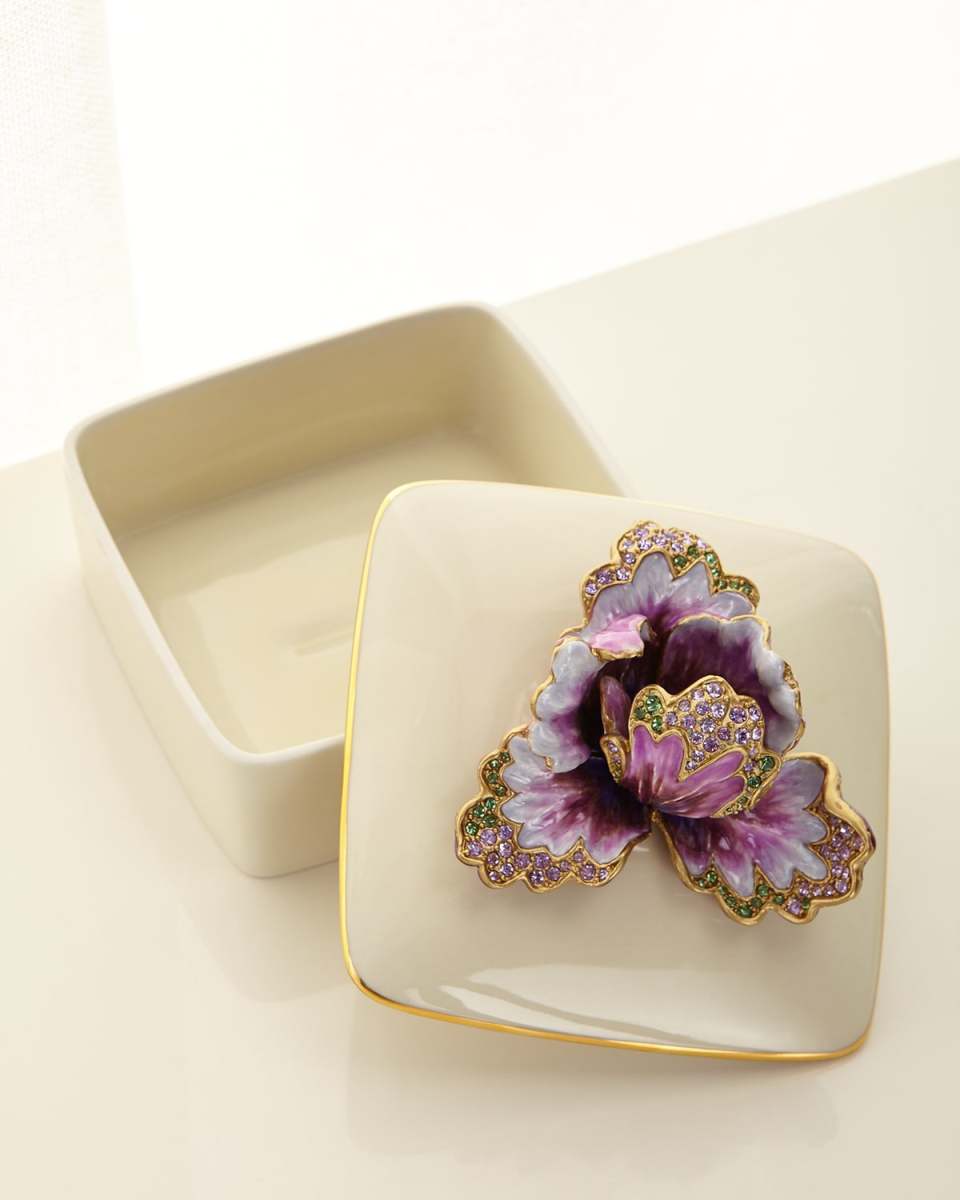 Handcrafted cream porcelain box edged in 14karat goldplate. Top is adorned with a metal tulip that has been handenameled and set with Swarovski® crystals. 4.5"Sq. x 4.25"T. Imported.