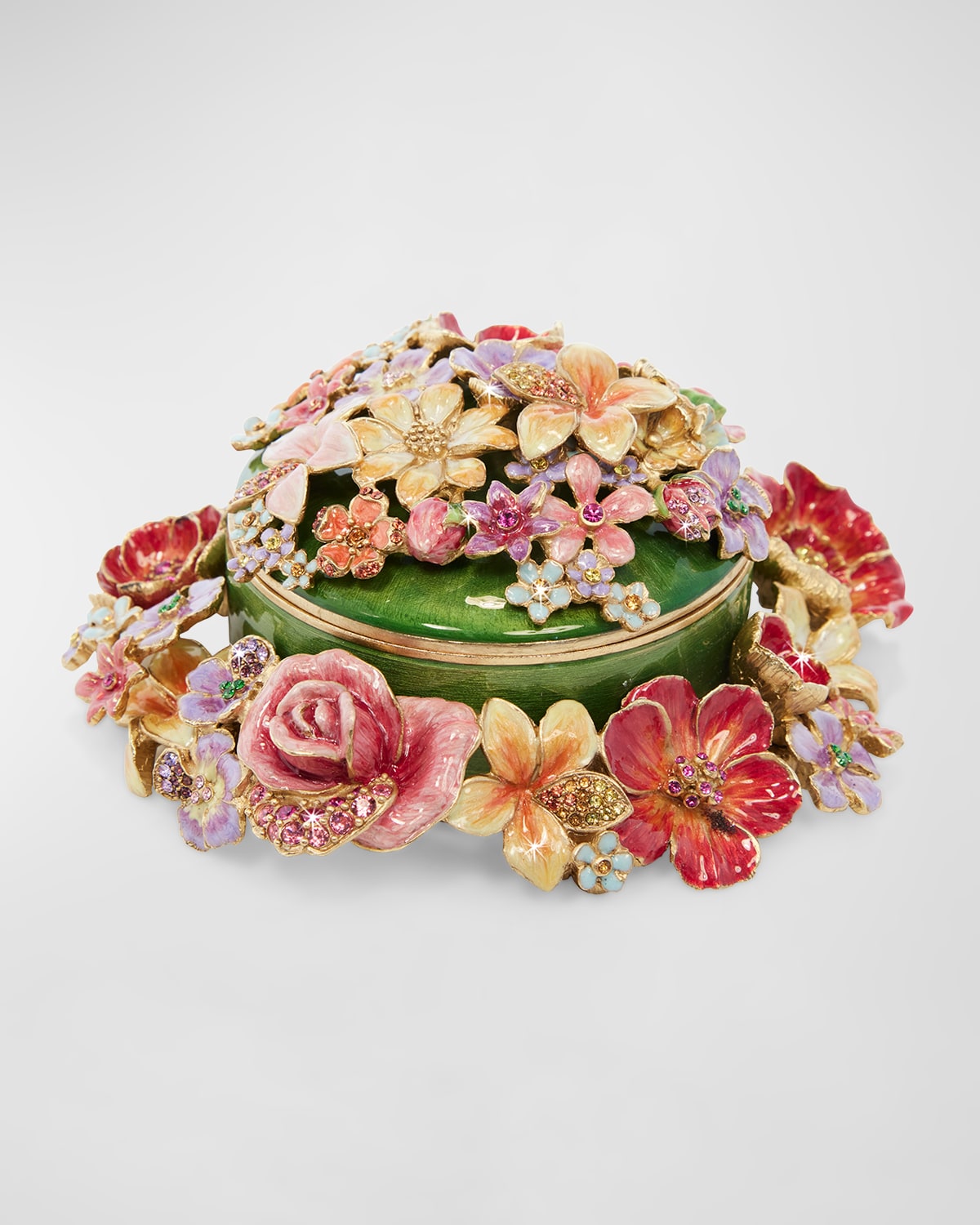 Finishing out our new Flora and Fauna Collection is this gorgeous flower box. There are over 30 flower castings that make up this box. Each one is handpainted with handplaced Swarovski® crystals. Box is crafted of pewter Approx. 5.5"Dia Made in USA