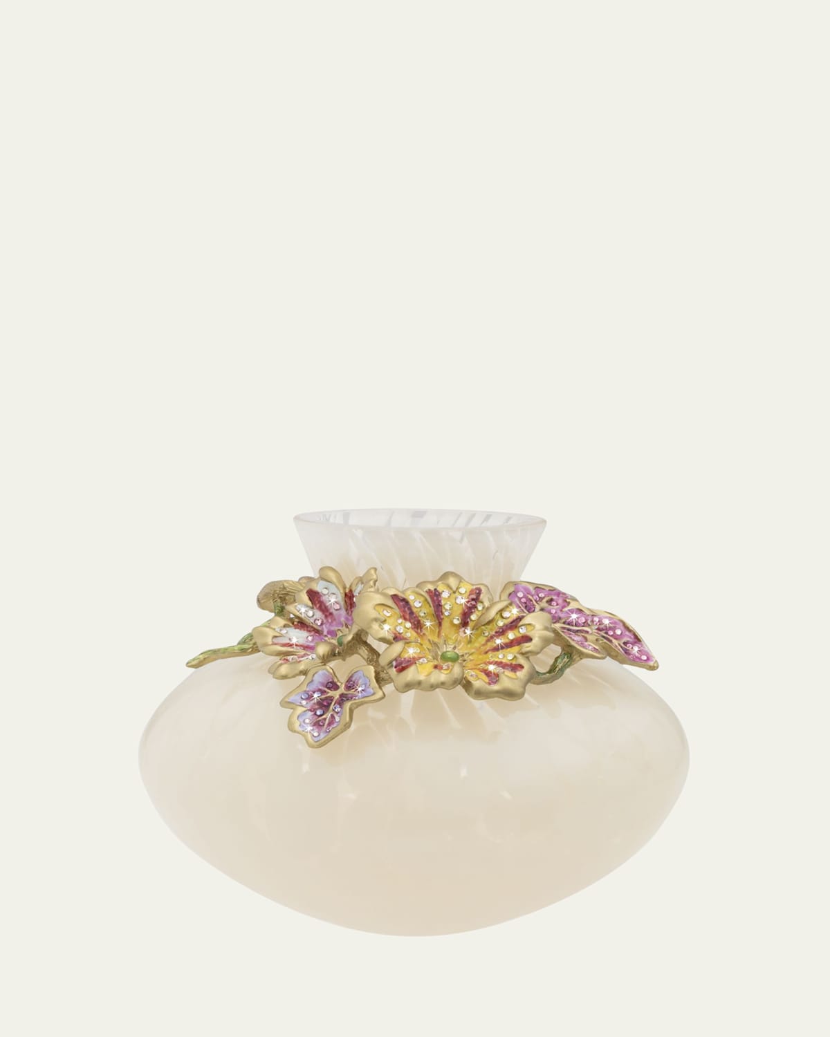 Handcrafted vase of handblown vase. Embellished with handcrafted flowers plated in 14karat gold and crystals. From the Great Gifts Collection. 6"Dia. x 5"T. Imported.