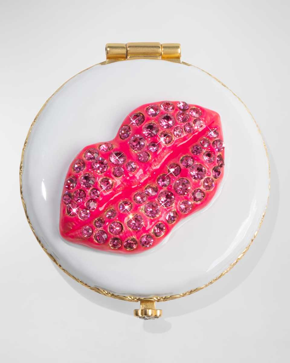 Handcrafted compact mirror. Brass with a 14karat gold finish. Hand enameled and handset with Swarovski® crystals. Two interior mirrors, one regular and one magnified. Approx. 2"Dia. Imported.