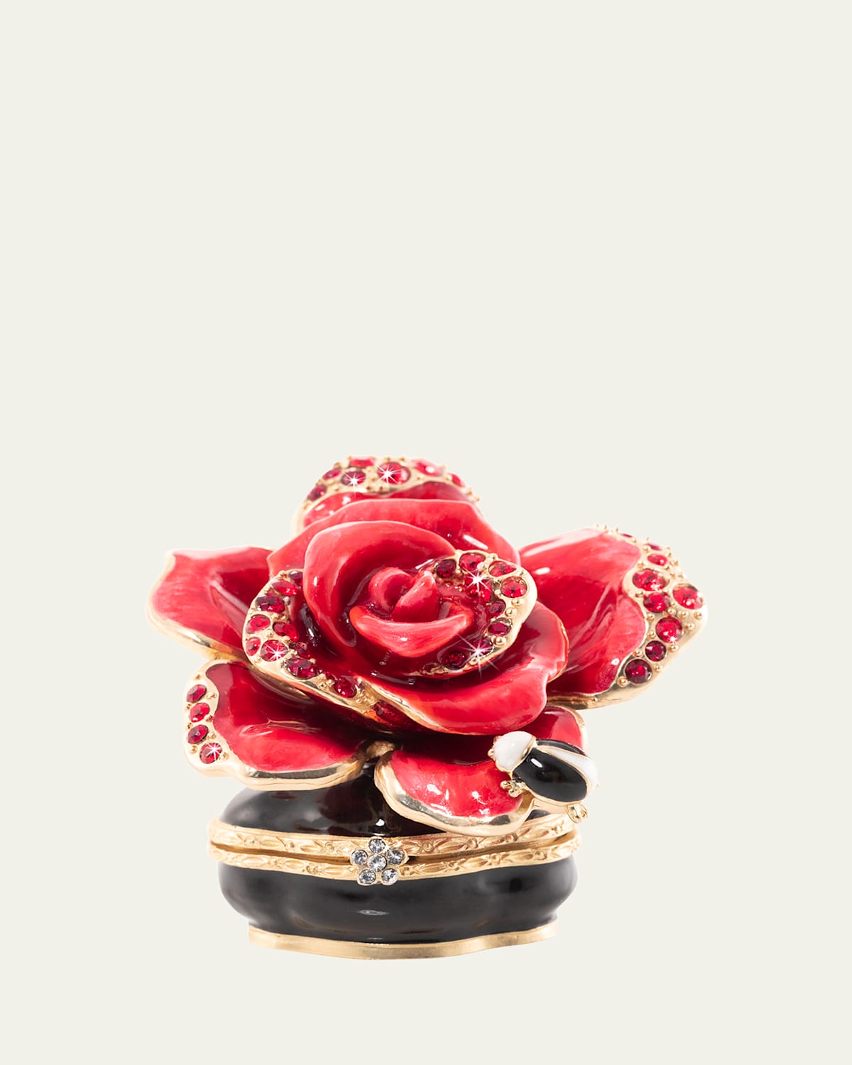 Cast in gorgeous detail and enameled by hand with accents of 14k gold, a Swarovski®encrusted, cherryred rose blossoms atop a black enamel box Opening to reveal a clean white enamel center with gold trim, this piece is the embodiment of beauty in simplicity Zinc, plated in 14kt matte gold, light brown antique Approx. 2"W x 1.75"D x 2"T Imported