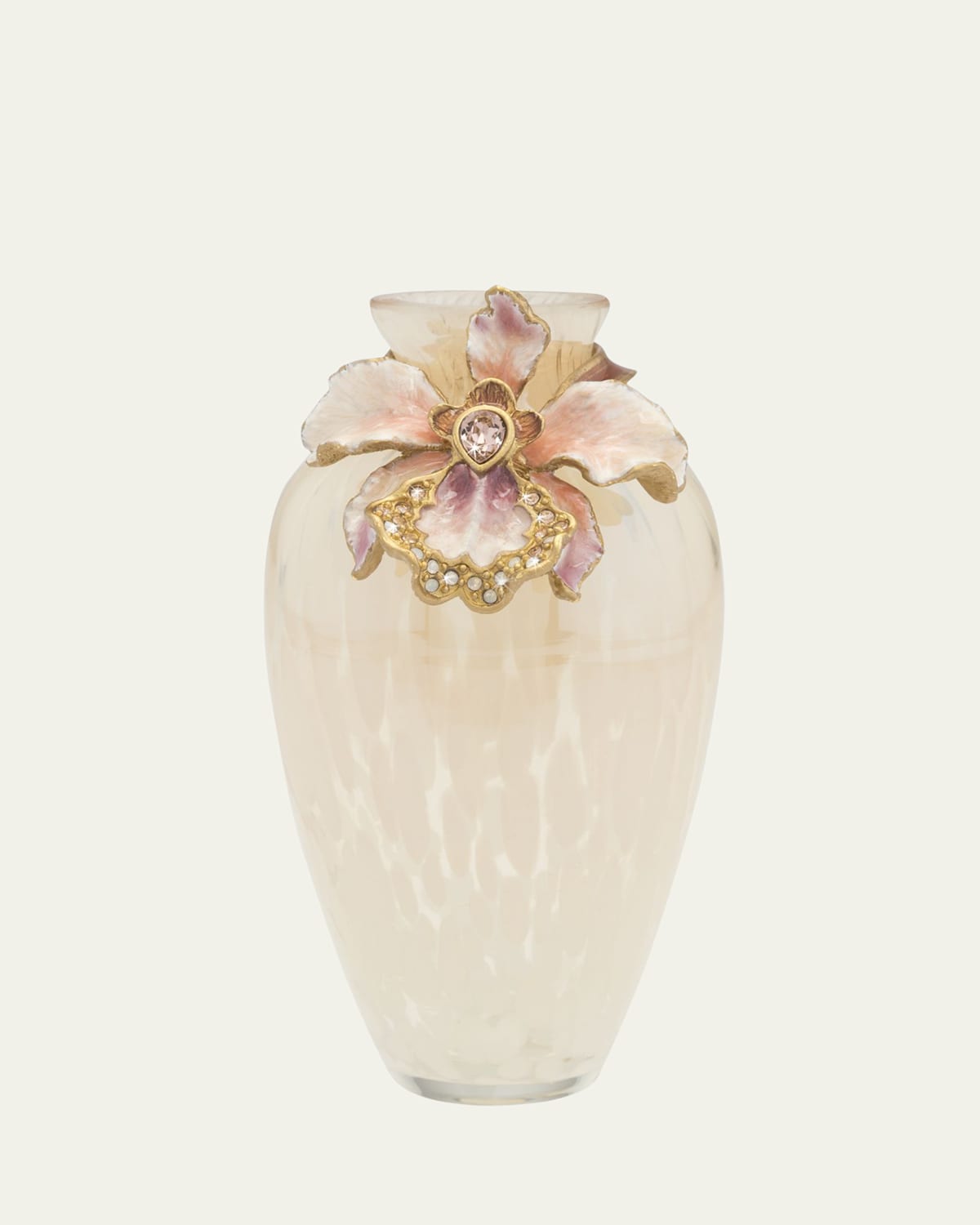 Handcrafted vase of handblown glass. Handpainted orchid plated in 14karat gold and embellished with crystals. From the Great Gifts Collection. 3"W x 5"T. Imported.