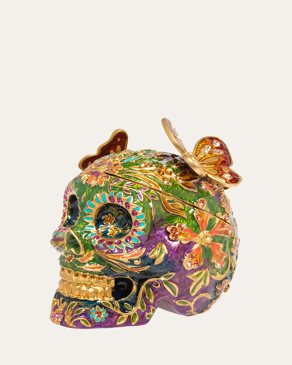 Handcrafted skull box with butterfly details. Metal casting with an a 14karat gold finish. Handenameled and handset with Swarovski® crystals. Handpainted design. Overall: 3"W x 3.5"D x 3.75"T. Imported.