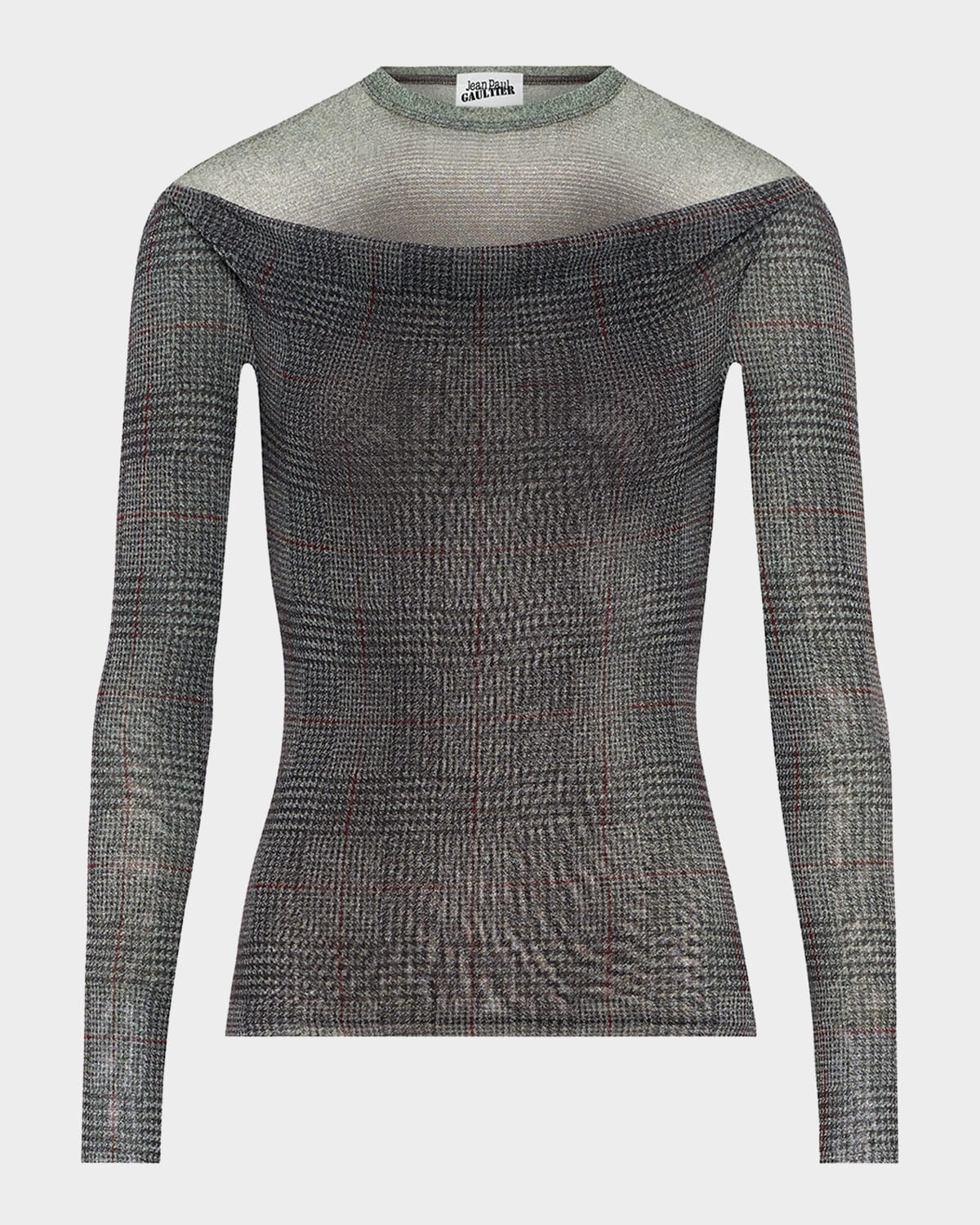 Jean Paul Gaultier top is crafted of a sheer mesh featuring a draped layer with Prince of Wales print Crew neckline Long sleeves Fitted Pullover style Nylon/polyamide Made in Italy