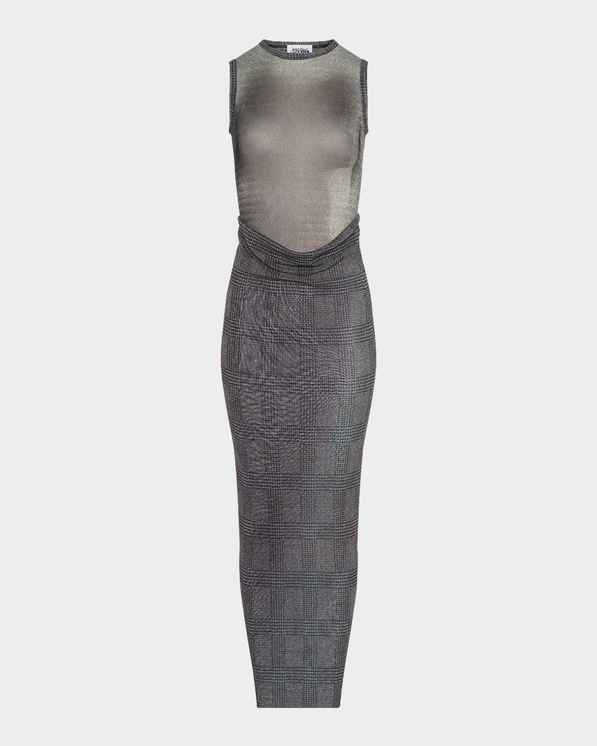 Jean Paul Gaultier dress is crafted of a sheer mesh layered with a draped check skirt Round neckline Sleeveless Bodyconscious silhouette Full length Slipover style Nylon/polyamide Made in Italy