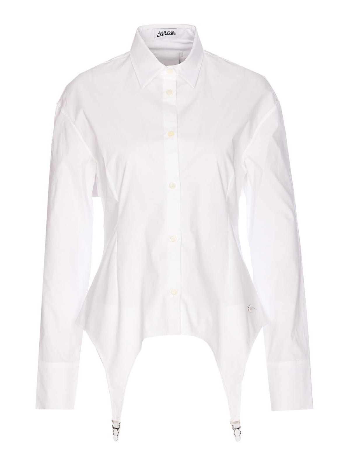Chemise Jean Paul Gaultier Porte Jaretekkes blanche avec boutons en aluminium, col régulier, manches longues, boutons sur les poignets, plaque, logo sur le nom du créateur. Couleur du créateur: blanc