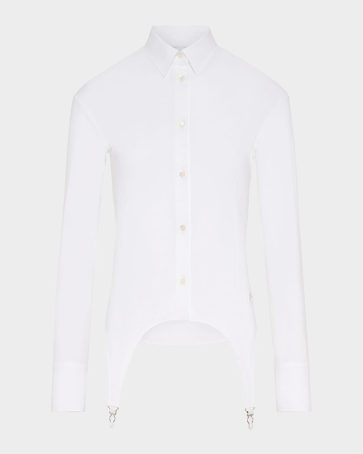 Jean Paul Gaultier shirt is crafted of crisp cotton poplin featuring garter hem detail and a slash back cutout Point collar; button front Long sleeves; button cuffs Button cutout back detail Engraved logo metal plate on hip Slim fit Garter front hem Cotton/elastane Made in Morocco
